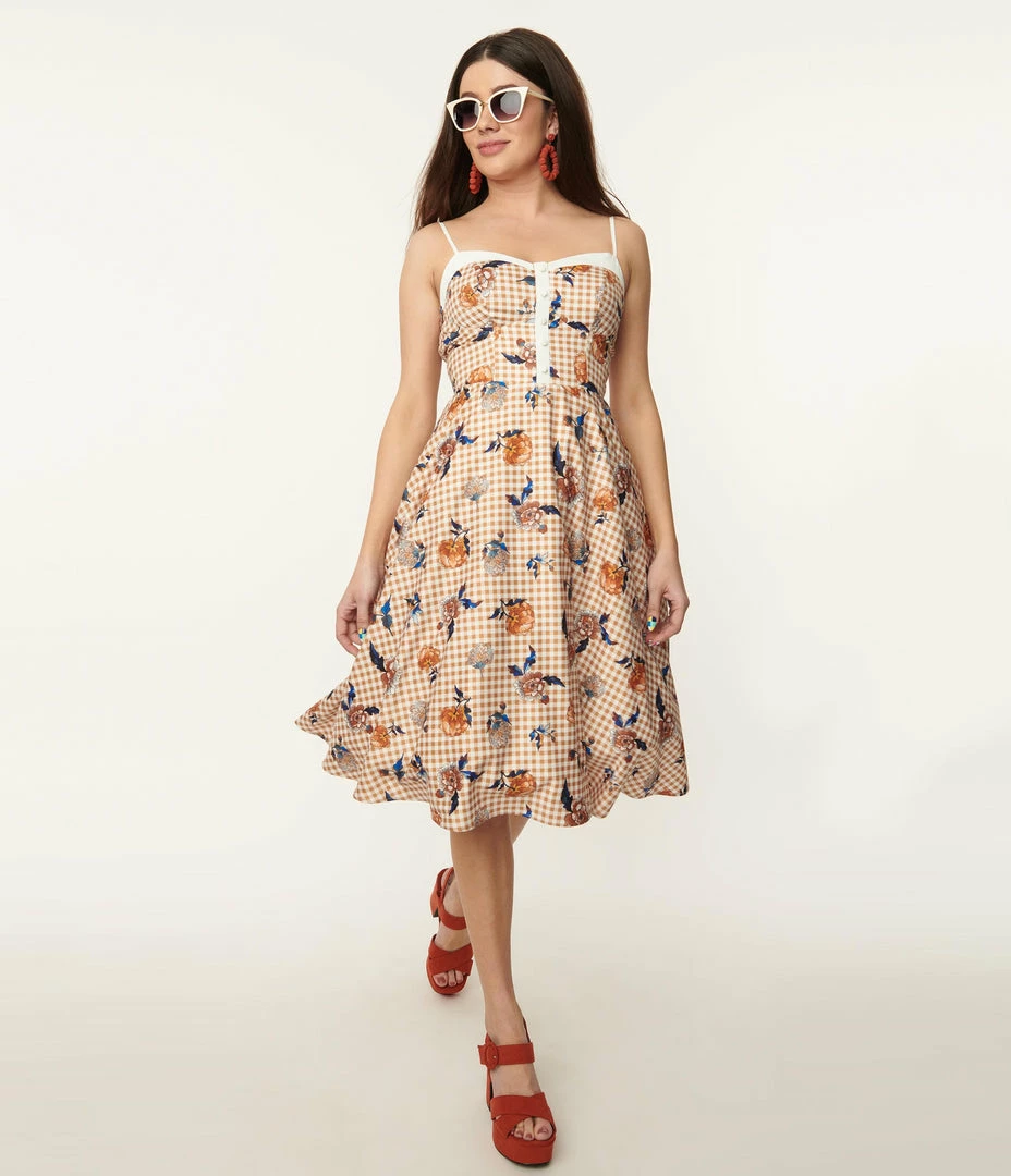 Outlet ๐ Sale Unique Vintage 1950s Rust Gingham & Floral Swing ๐ Dress ๐งจ