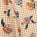 This sweet swing dress is crafted in a lightweight woven fabric with rust orange and navy blue florals throughout the rust and white gingham backdrop. Outfitted with adjustable spaghetti straps, a back zipper, and side smocked panels.