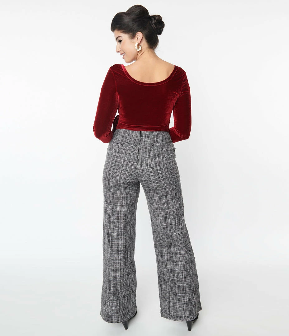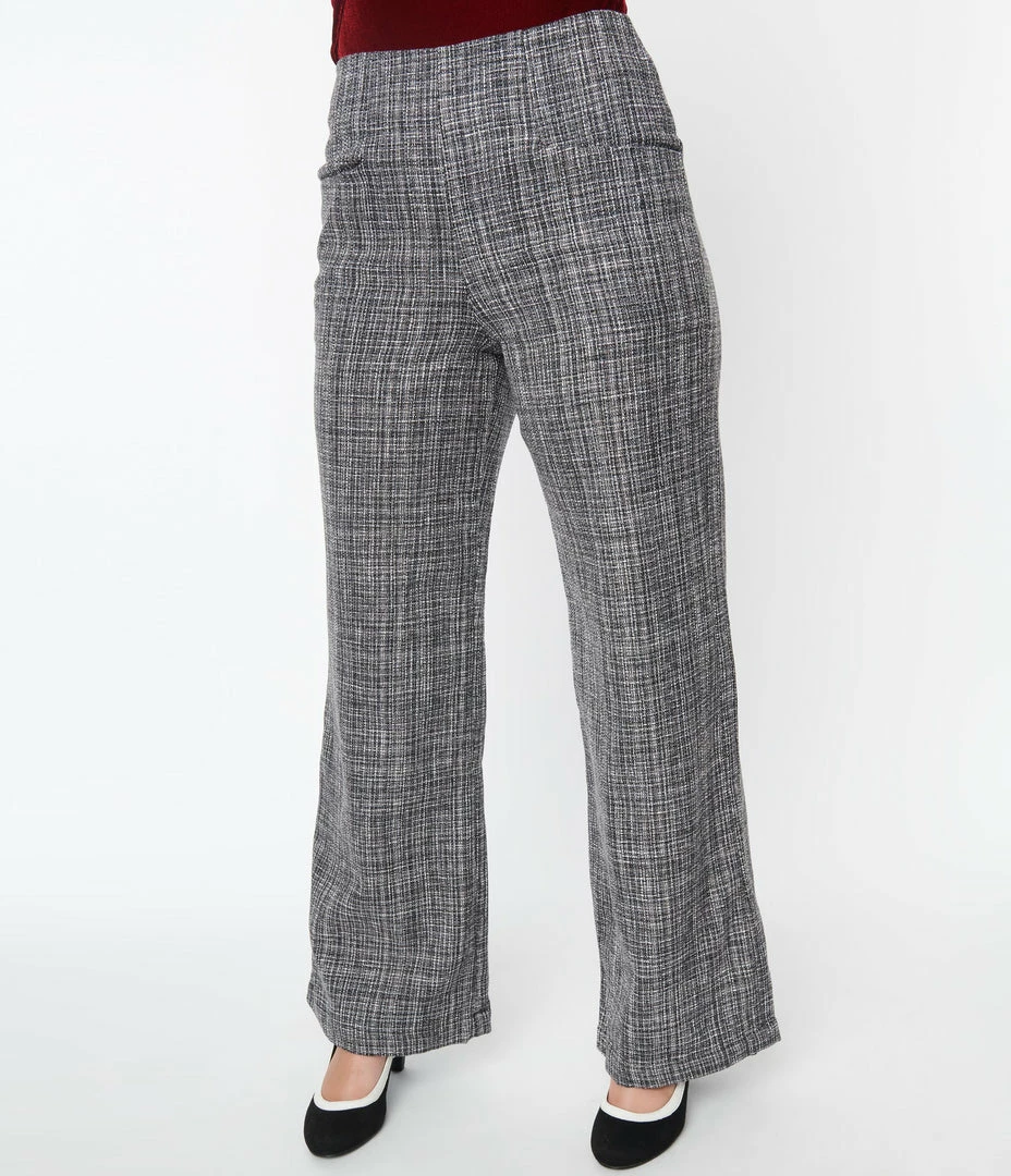 Never hesitate, dolls! Leave them in the dust with the stunning Abia Pants from Unique Vintage, a fabulous pair of high waisted retro separates, crafted in a marvelous woven tweed of grey, white, and black. The high waist is cinched with a back zipper while the fitted form drops into wide legs, complete with lining for all day comfort. Outfitted with side pockets for modern function!