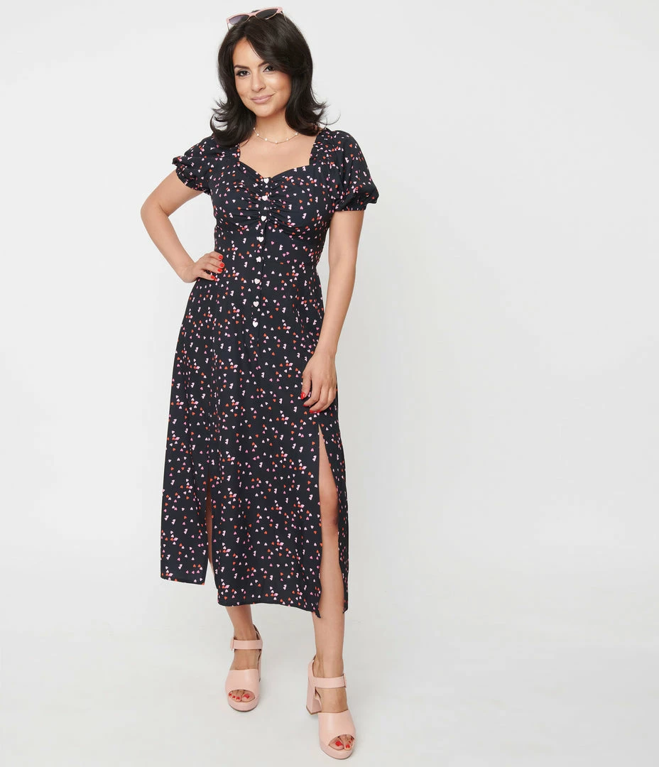Refuse to settle down, gals! A stunning piece for frolicking through life, the Wild Hearts Run Free Dress from Unique Vintage is crafted in a lightweight woven fabric that dances with pink and red hearts printed throughout the black backdrop. The sweetheart neckline is framed by short Bardot sleeves while a partial button up placket and smocked back waistband nips in your figure. The sweeping midi skirt drops past your knees while dual front vents lend a flirtatious embellishment!