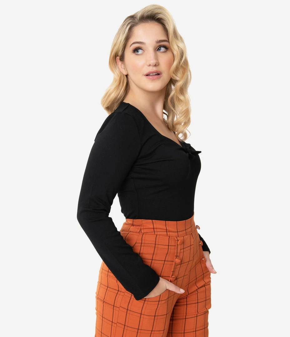 You can’t be intimidated, gals! A gorgeous piece for your retro ensemble, the Maxine Top from Unique Vintage is crafted in a fabulous black knit to flatter your feminine figure. The sultry open neckline is centered by a sweet faux bow while slender long sleeves provide comfortable coverage as you take on your next fight!