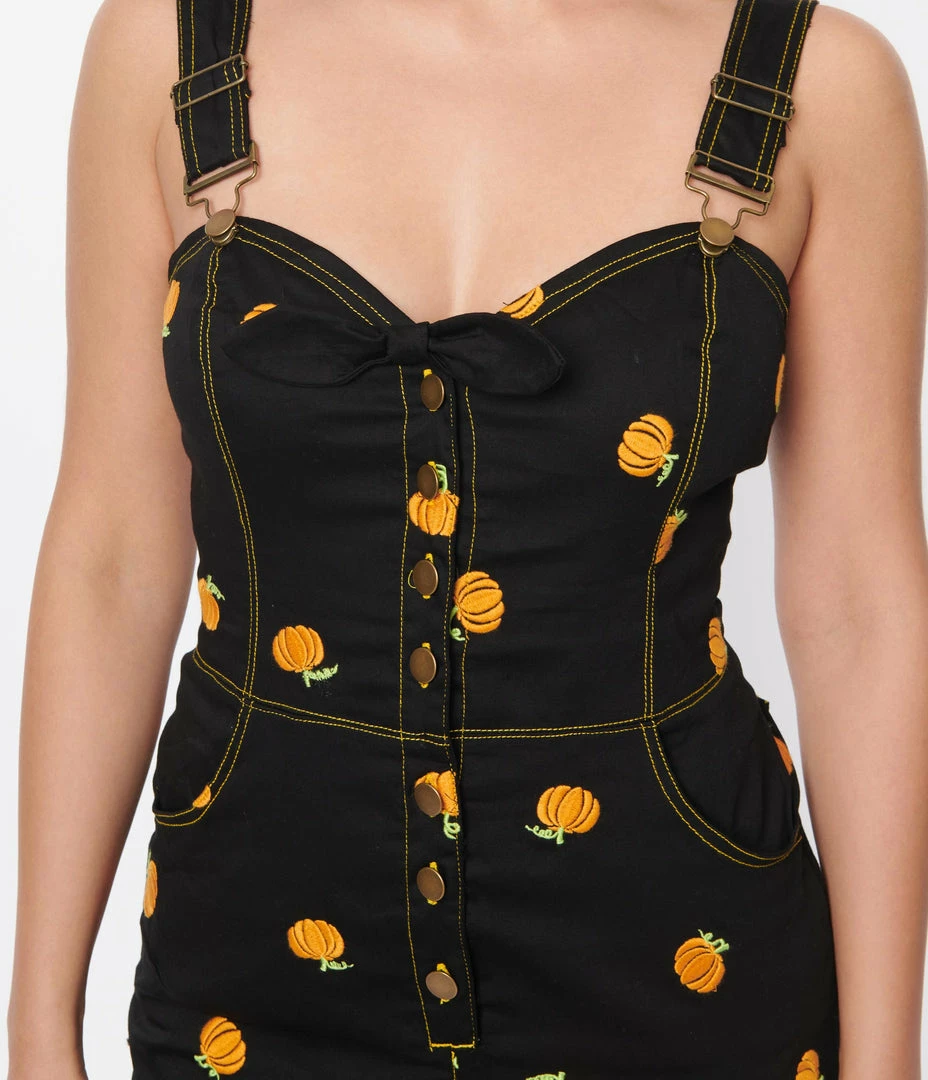 This adorable fitted pinafore features orange embroidered pumpkins throughout the black woven fabric. Outfitted with adjustable buckle straps, a button up bodice, and side and back pockets.