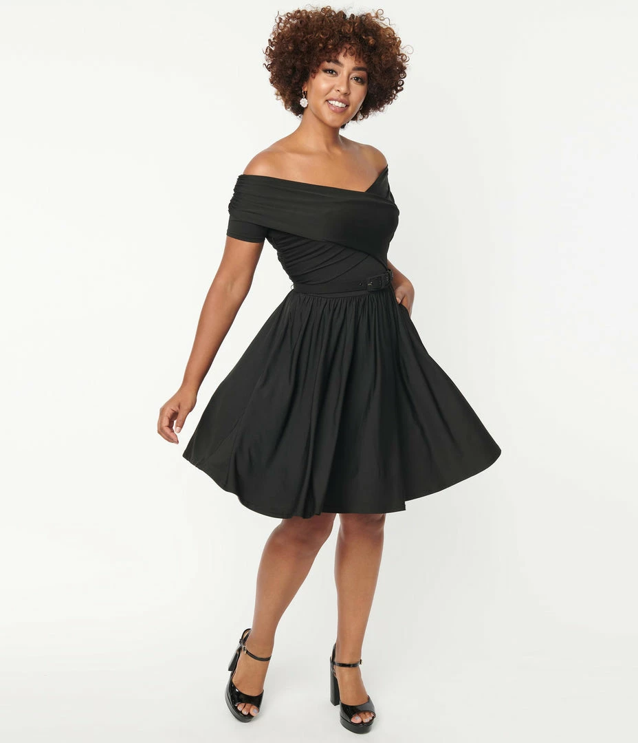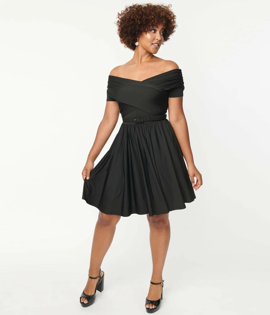 Stop and enjoy center stage, dolls! This enchanting fit and flare dress from Unique Vintage is crafted in a soft stretch knit blend in solid black. The sultry off the shoulder surplice neckline is framed by short sleeves as the seamed waist is embellished with a belt. The gathered flare skirt dances above the knees while hidden side pockets lend a touch of modern sensibility!