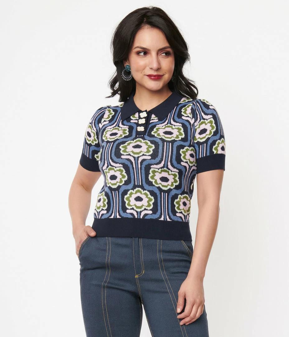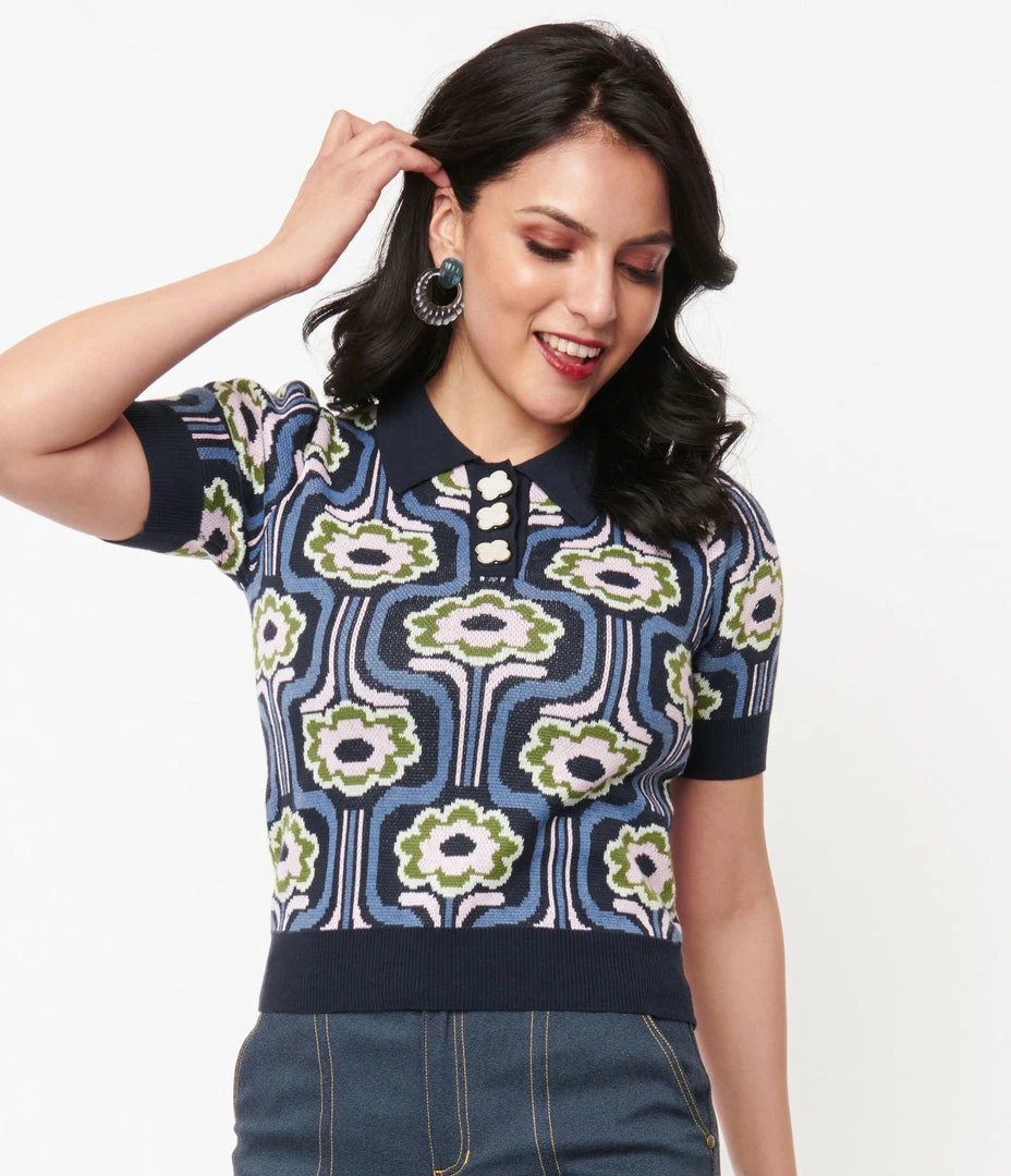 A supple taste of divine style, the Prim & Pretty Sweater from Unique Vintage is a retro staple crafted in a fabulous stretch knit that dances with a beautiful daisy floral pattern in pink and green throughout a dusty blue backdrop. The flower buttons lead to a sweet classic collar and are framed by dapper short sleeves. Complete with a stay-in-place hem to top off this can’t-live-without separate!