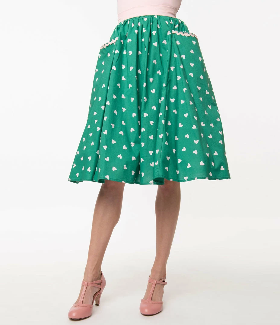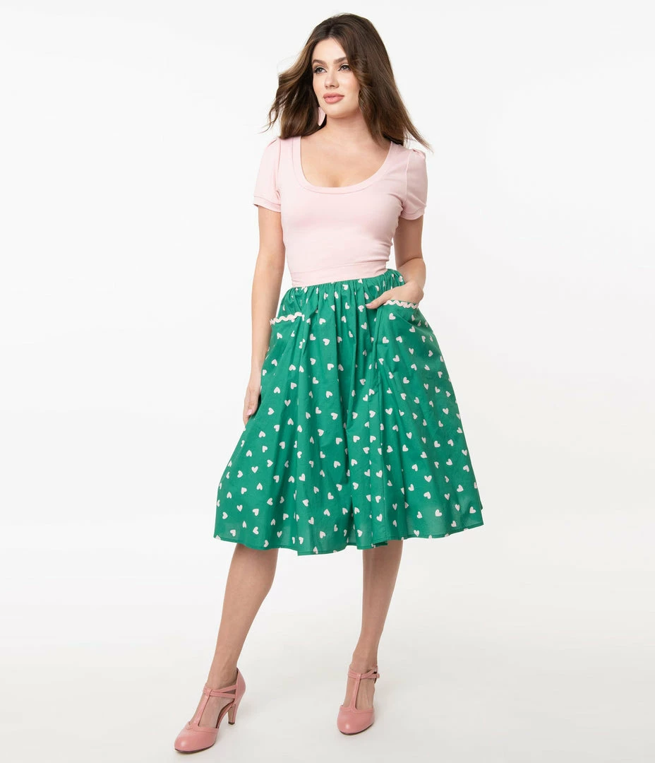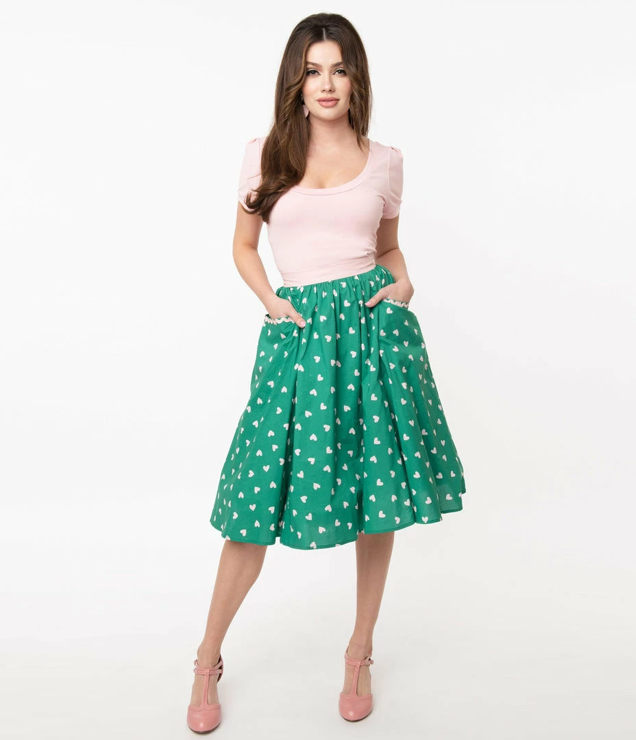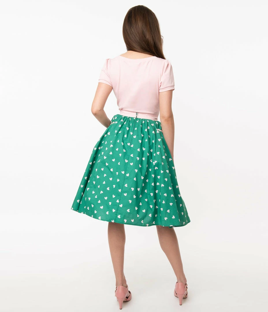Cheapest ⭐ Sale Unique Vintage Green & Pink Hearts Print Susannah Swing 👗 Skirt ⌛