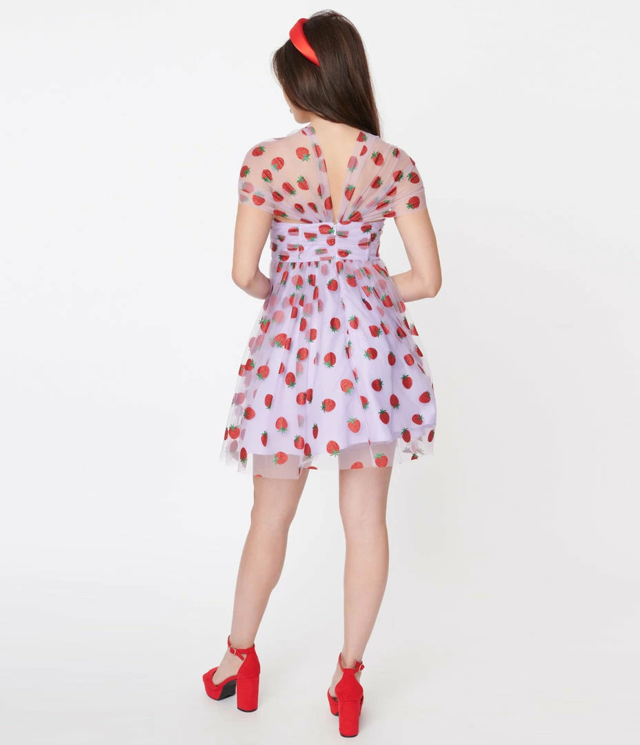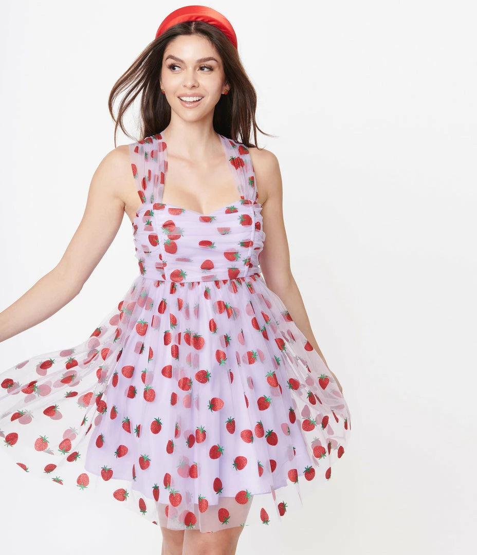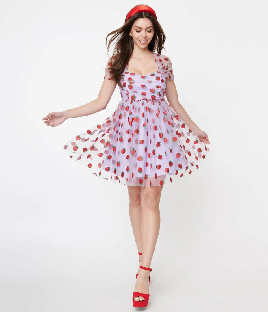 The source of joy is a cute dress, darling! An adorable silhouette from Unique Vintage, this playful babydoll is crafted in a lightweight lavender purple mesh that flows over your form with red glitter printed strawberries throughout. The sweetheart neckline features padding and boning for subtle structure while the romantic cap sleeves provide a flattering frame to your visage. The high seamed waist is cinched with a back zipper while the gathered flare skirt dances high above the knees and over matching lining for comfortable frolicking!