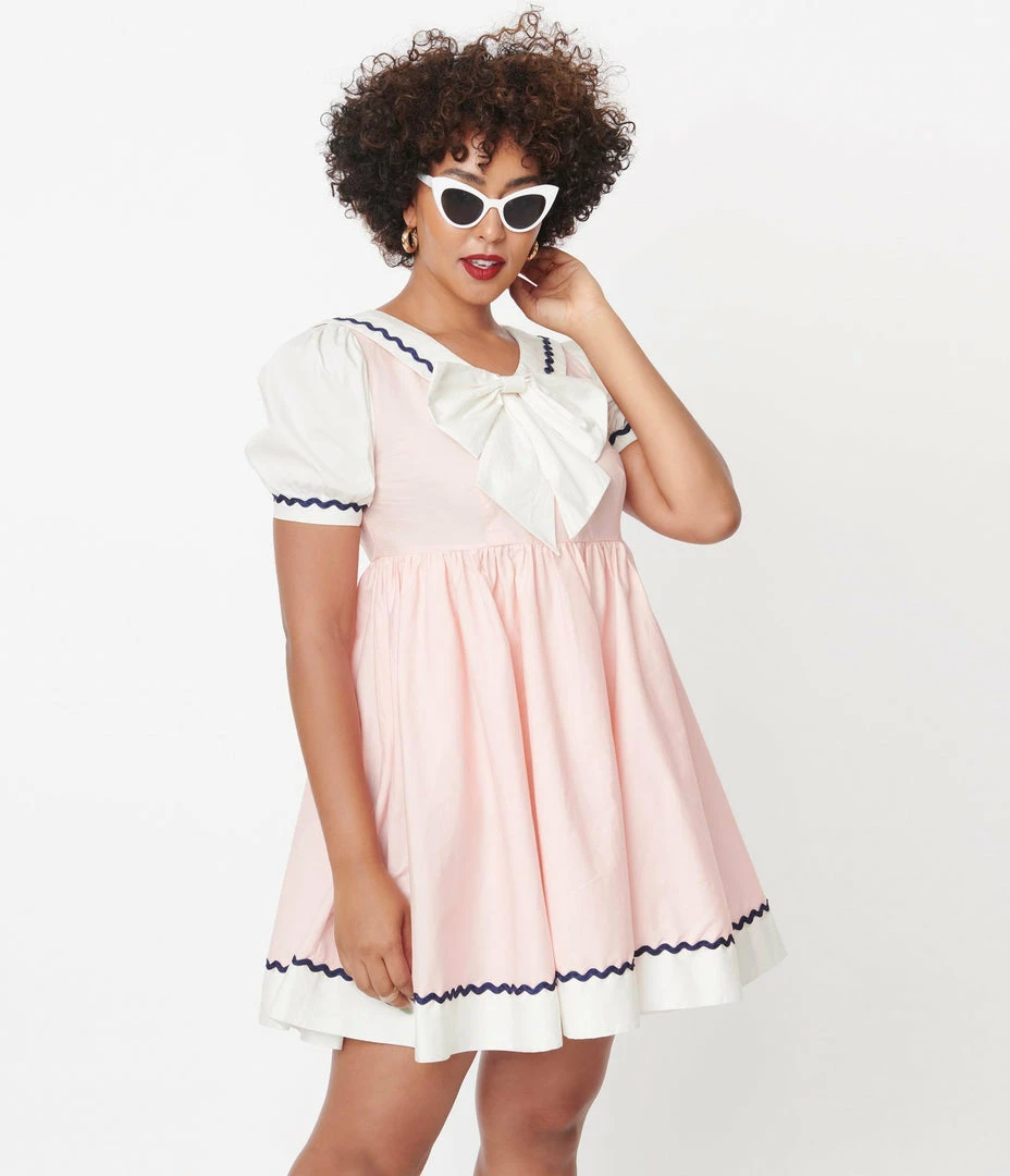 Universal cuteness for retro frolics, dames! This adorable babydoll piece from Unique Vintage is crafted in a light pink woven fabric that dances with ivory white accents throughout. The Darla Dress features a bold white faux bow and modest neckline that is secured with a partial button front and is embellished with a retro sailor yoke and charming short sleeves. The seamed waist tops a gathered babydoll skirt that drops into a white border hem, outfitted with side pockets for modern function!