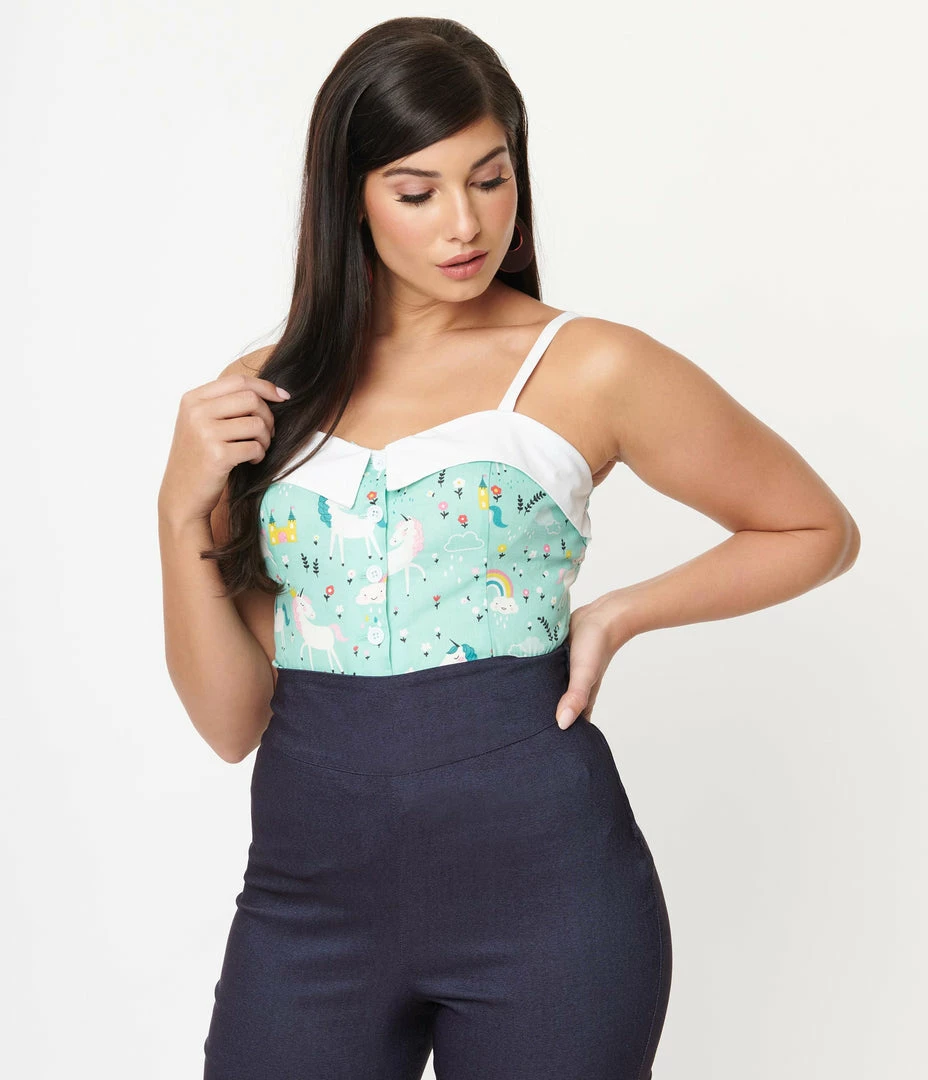 Crafted in a lightweight woven fabric that dazzles in a stunning fairytale print with castles, unicorns, rainbows, and florals throughout a mint backdrop. The button up front and smocked back provide a fabulous cinch to the princess seamed bodice while the button adjustable spaghetti straps allow for a perfect fit. Complete with a solid white fold over neckline and shortened hemline.