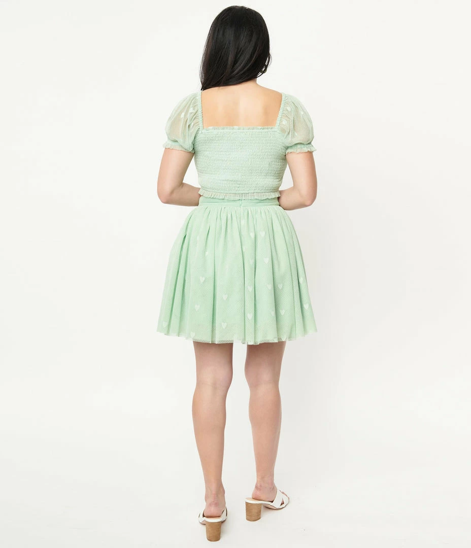 Grab a slice or two, dames! This adorable separate from Unique Vintage dances with swiss dots and hearts throughout the mint mesh. The Sweetie Pie Skirt features a high banded waist, cinched with a back zipper while layers of mesh and mint tulle cascade over mint lining and dances high above your knees, complete with hidden side pockets for modern function!