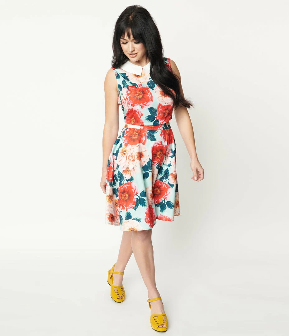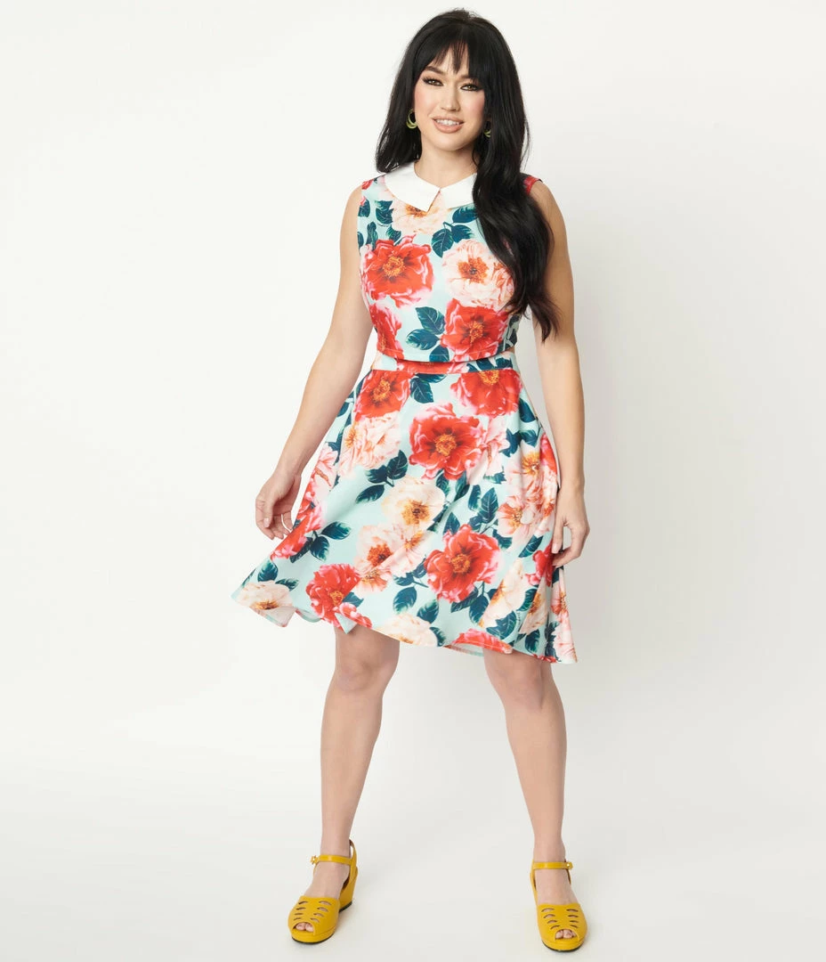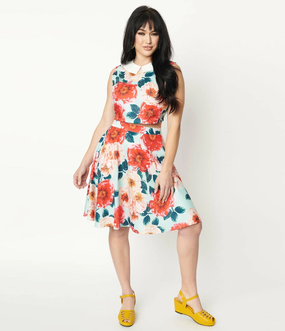 Take summer for a spin, gals! The retro inspired skirt from Unique Vintage is crafted in a lightweight woven fabric that dances with a beautiful floral print in red and pink cascading through a mint backdrop. The banded waist is cinched with a back zipper while flare skirt dances above your knees and features side pockets to keep your tools close at hand!
