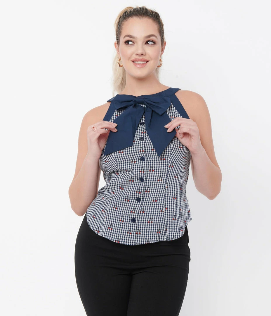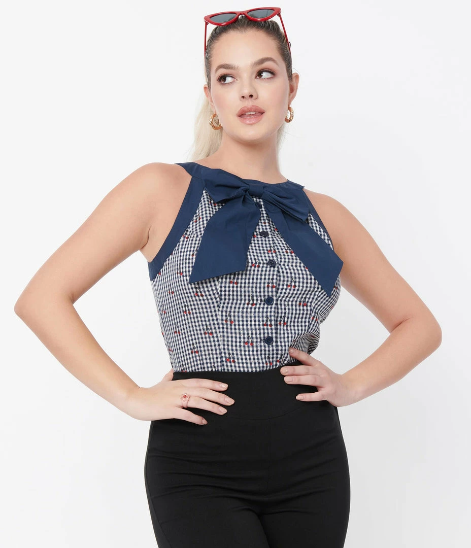 Outlet 🔥 Sale Unique Vintage Navy Gingham & Cherry Print Paulson Top 🛒