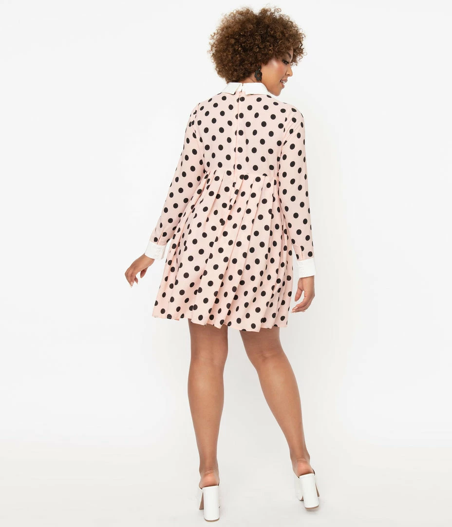 Declare your major in mid-century mod, dolls! Fresh and adorably flirtatious, the Peggy Dress from Unique Vintage is crafted in a lightweight crepe that dances with black polka dots printed throughout a light pink backdrop. The solid white collar is framed by long sleeves that drop into solid white button cuffs. The seamed high waist is cinched with a back zipper while the flare skirt is structured with pleats and outfitted with side pockets!