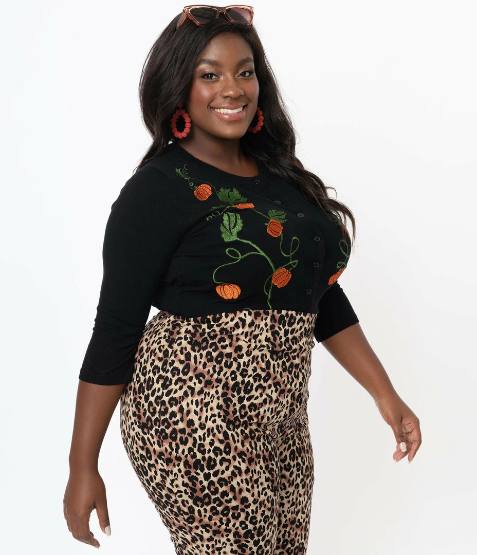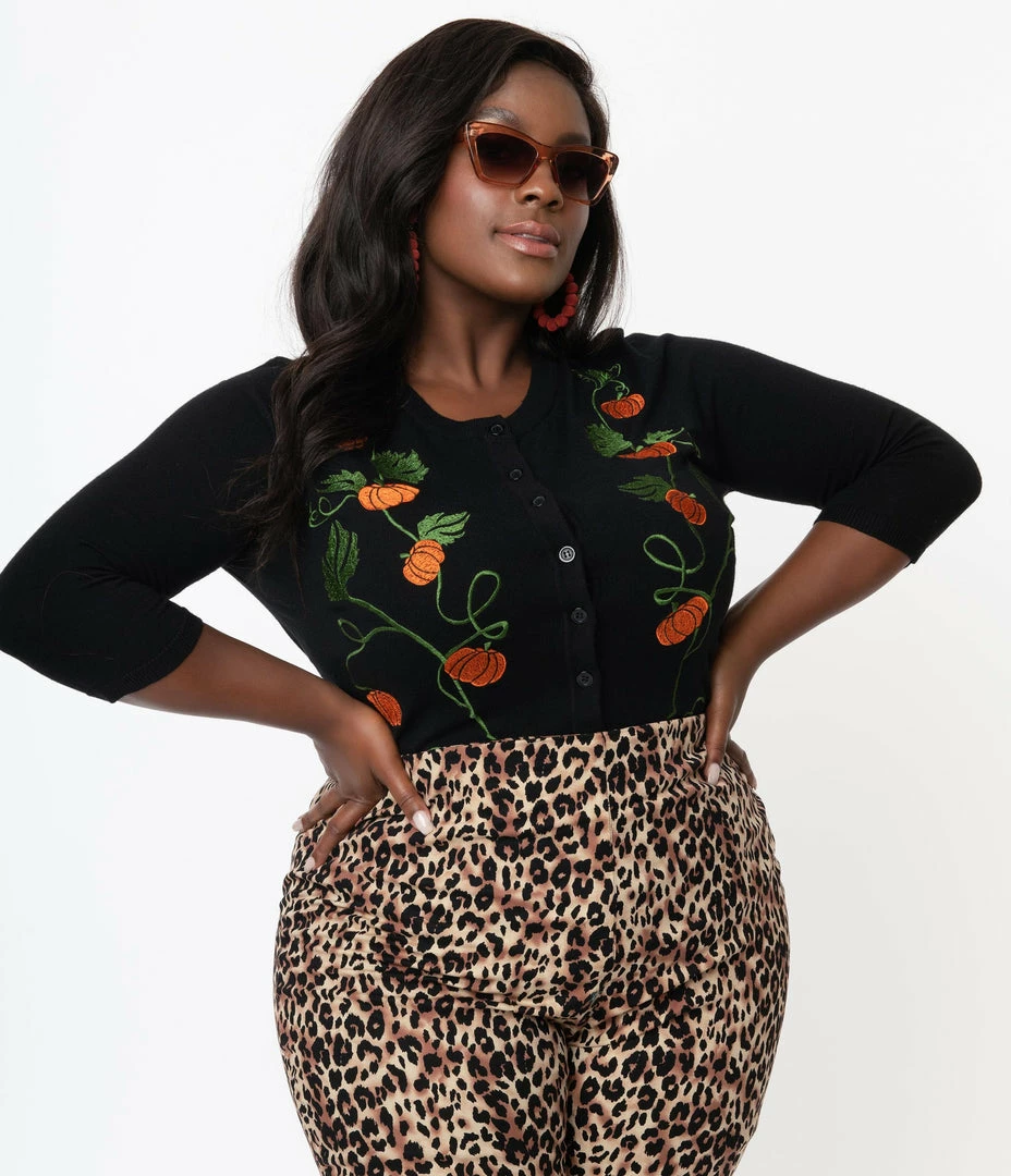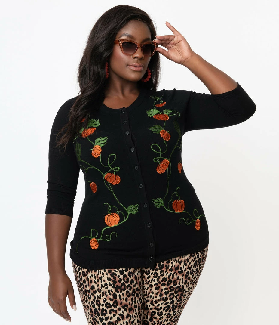 Prepare to be devoured, darling! An incredibly soft black knit cardigan from Unique Vintage, this plus size spooky separate is a perfect piece to keep you warm on your evening strolls. The Bookworm Cardigan features adorable orange embroidered pumpkins dancing throughout while the button up front leads to a modest scoop neckline while the three-quarter length sleeves provide bewitching enchantment!