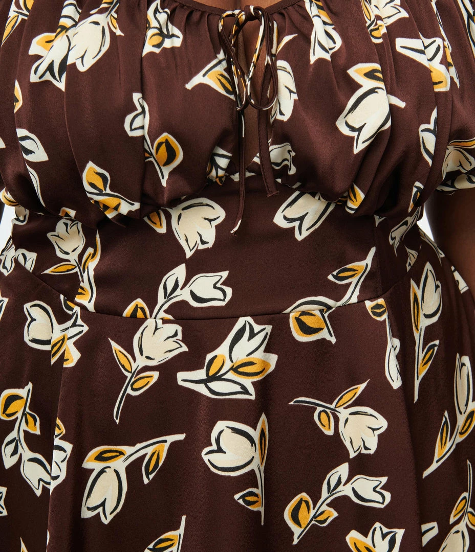 Budget 🔥 Sale Unique Vintage Plus Size 1950s Brown & Ivory Floral Print Swing 👗 Dress 🎁