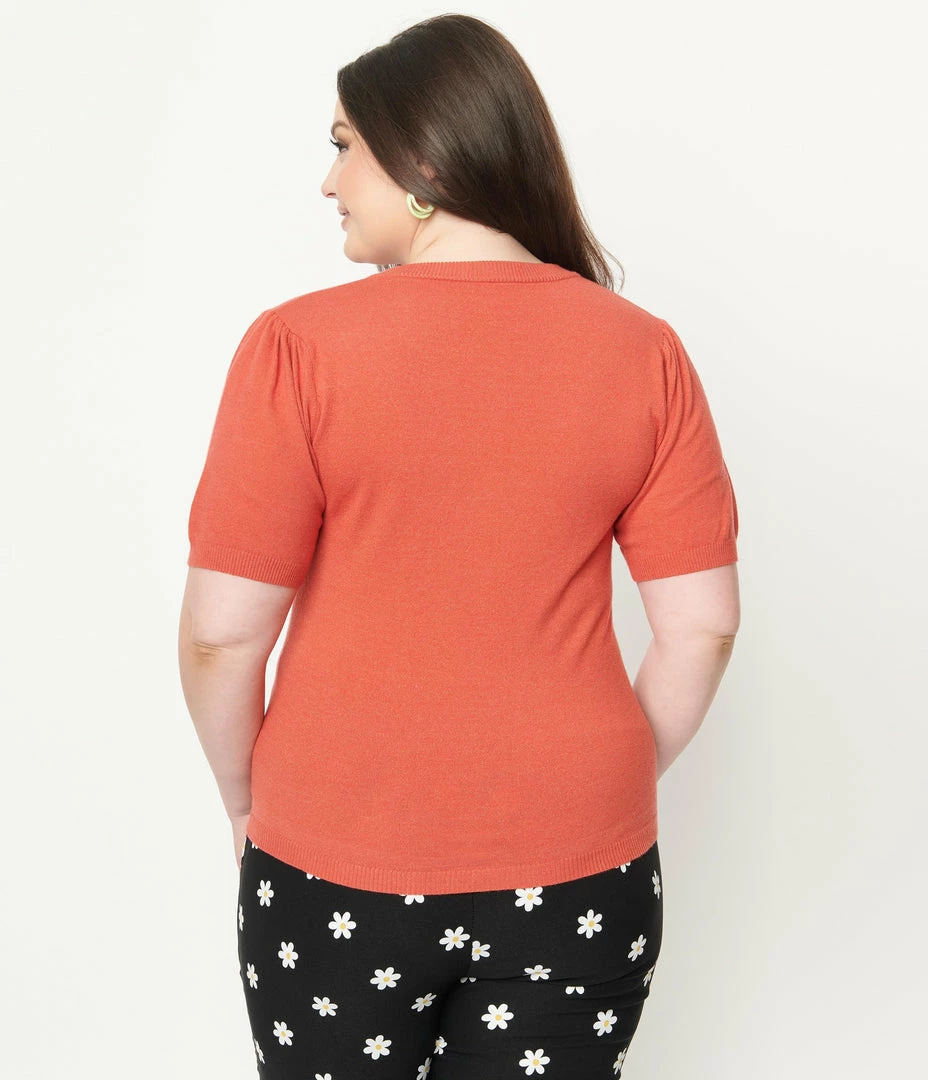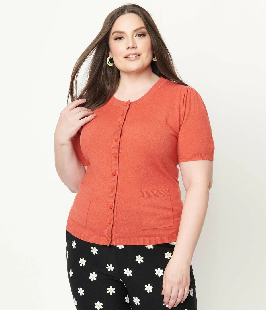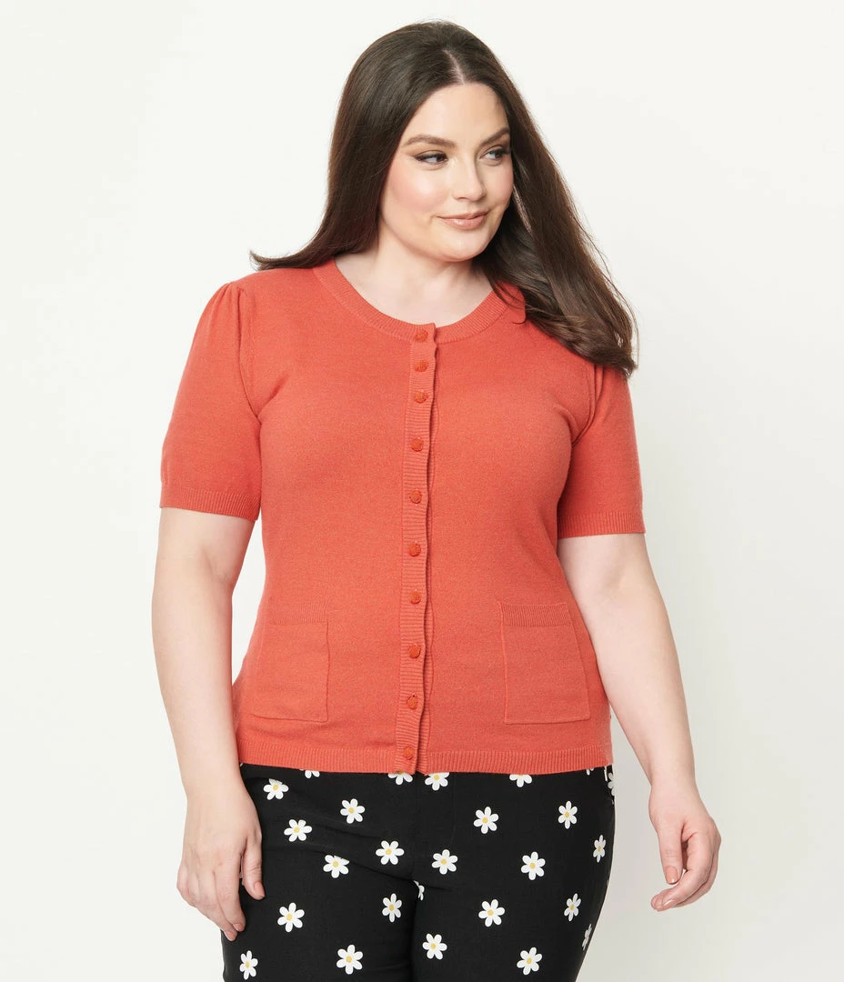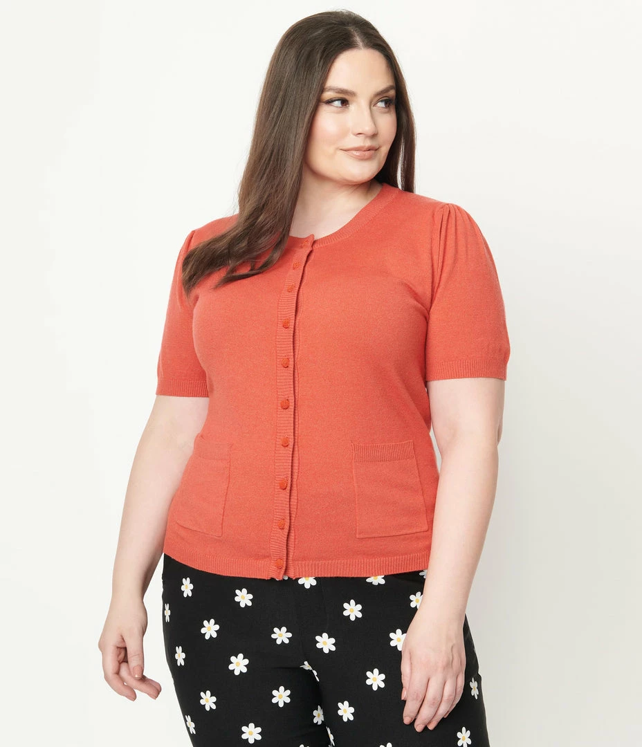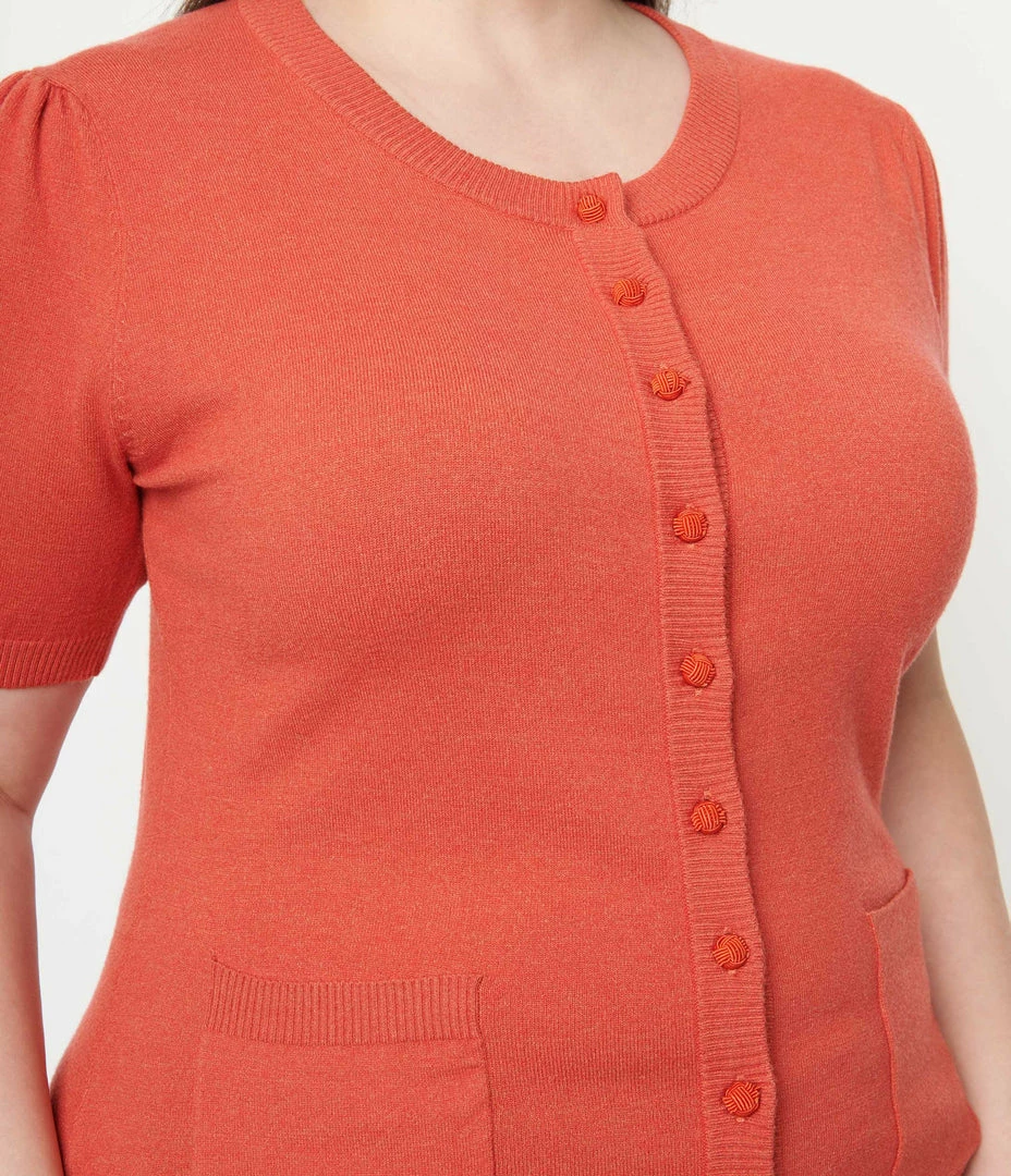 As soft as your heart, darling! This sweet burnt orange plus size cardigan from Unique Vintage is crafted in a marvelous soft sweater knit. The Telluride Cardigan features a button up front and a modest scoop neckline, framed by charming short sleeves and complete with front pockets!