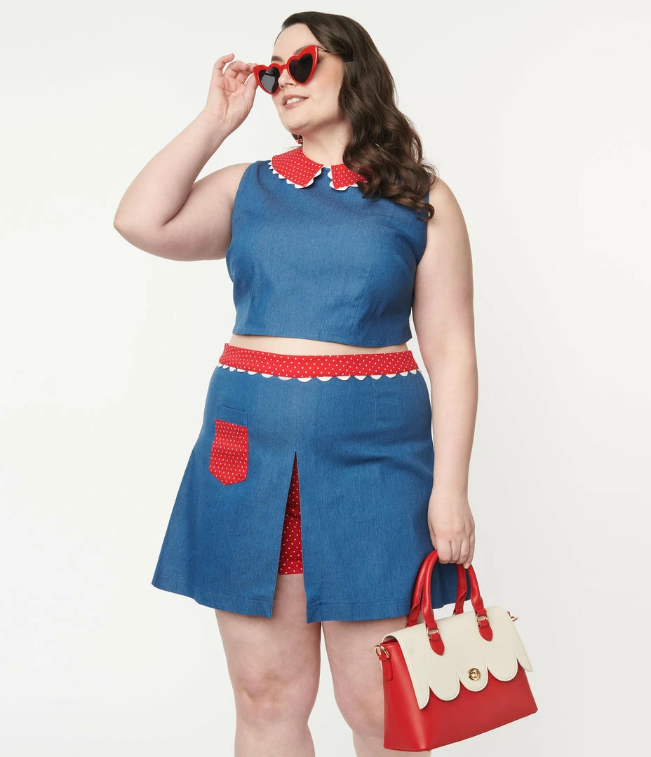 This adorable set of plus size shorts are crafted in sturdy woven red fabric that dances with white pin dots while a playful chambray blue skirt frames your hips for a charming skort style. Outfitted with a back zipper and a darling coin pocket.