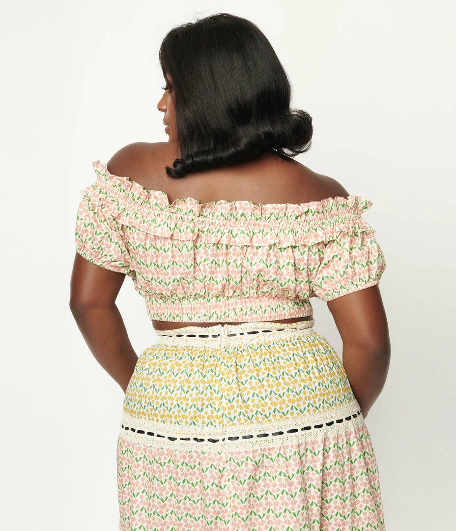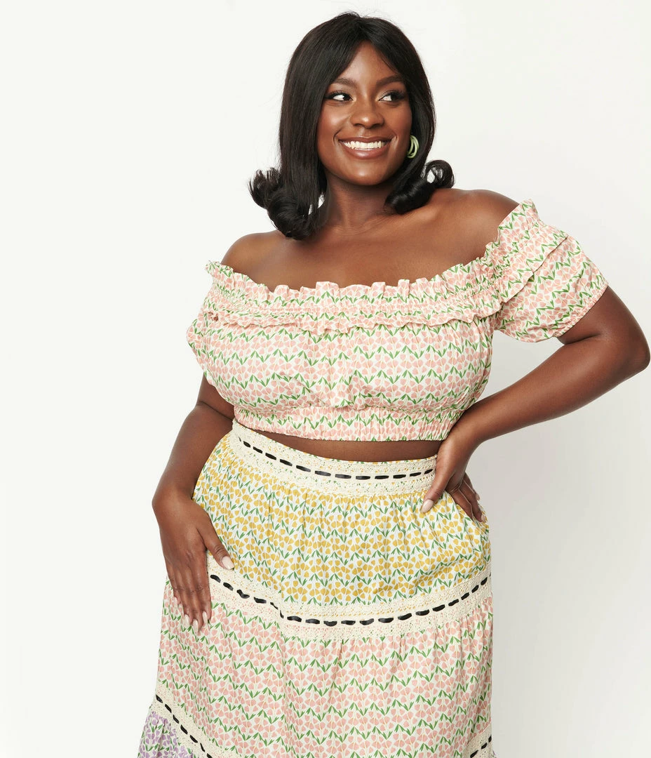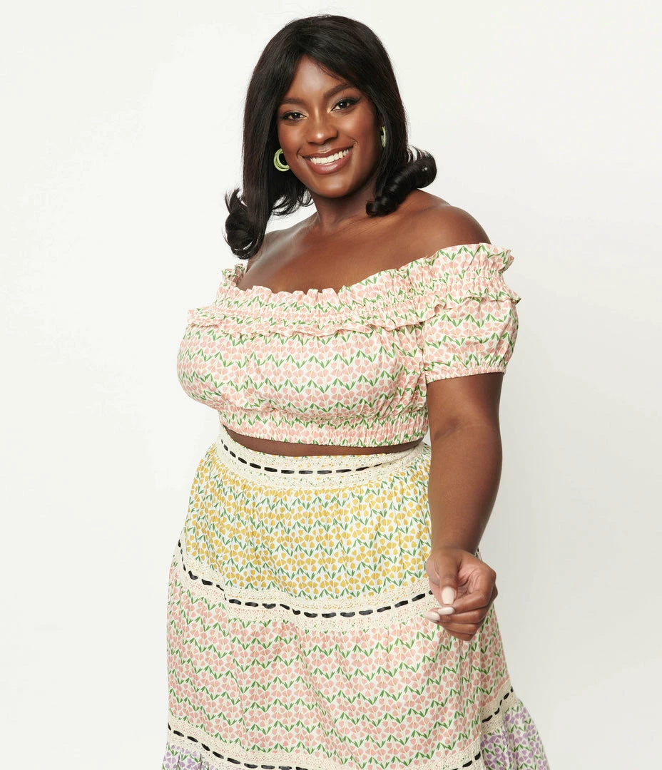New 💯 Sale Unique Vintage Plus Size Cream & Pink Floral Print Ruffle Up Crop Top 🤩