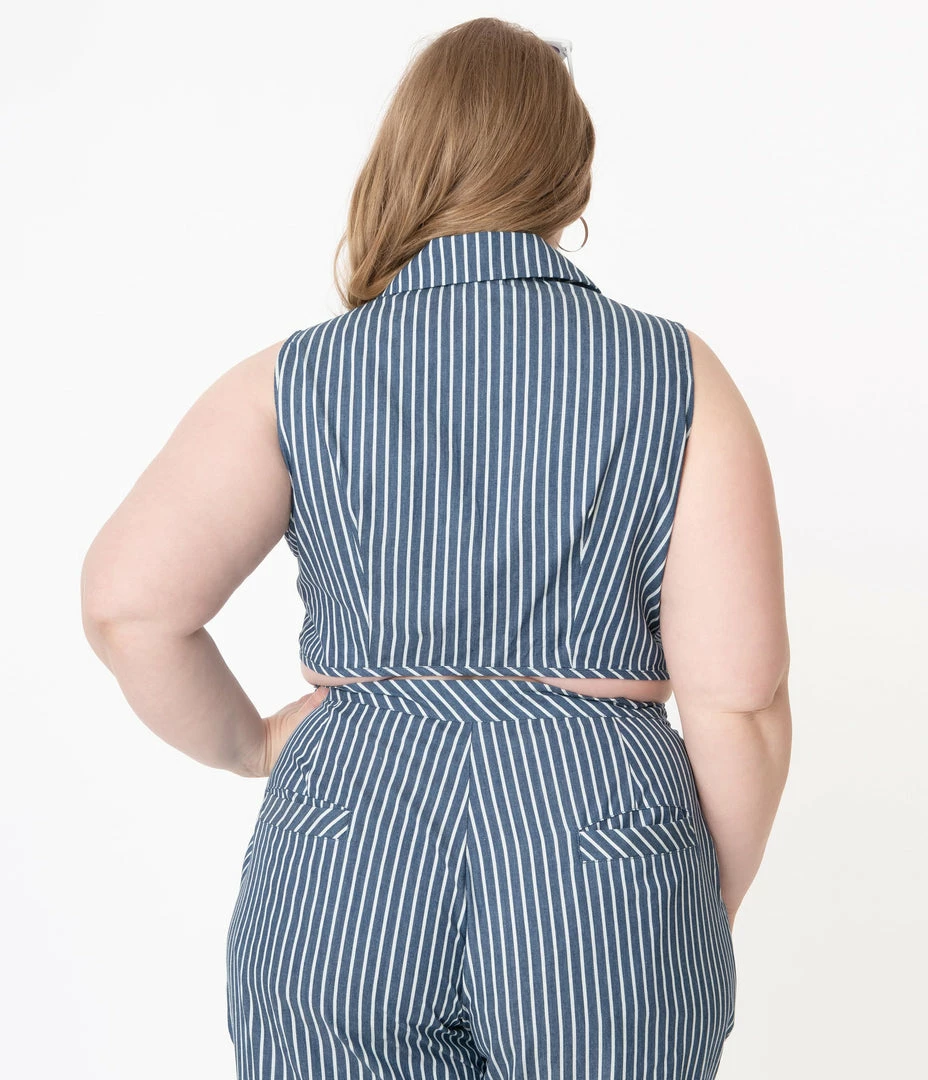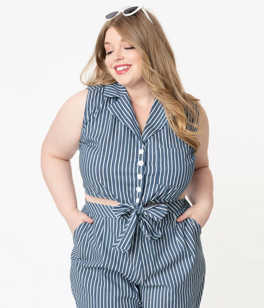 Get the beach craze started, darling! This sweet plus size button up crop top from Unique Vintage is cast in a lightweight fabric that dazzles with dark blue and white stripes. A fabulous notched lapel and darling chest pocket lend retro accent to this sleeveless separate while the front self tie adds sweet styling to your ensemble. Take the world on vacation!