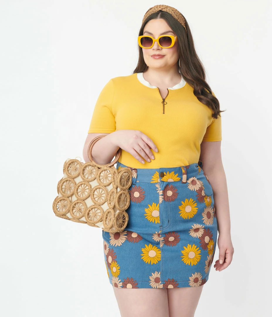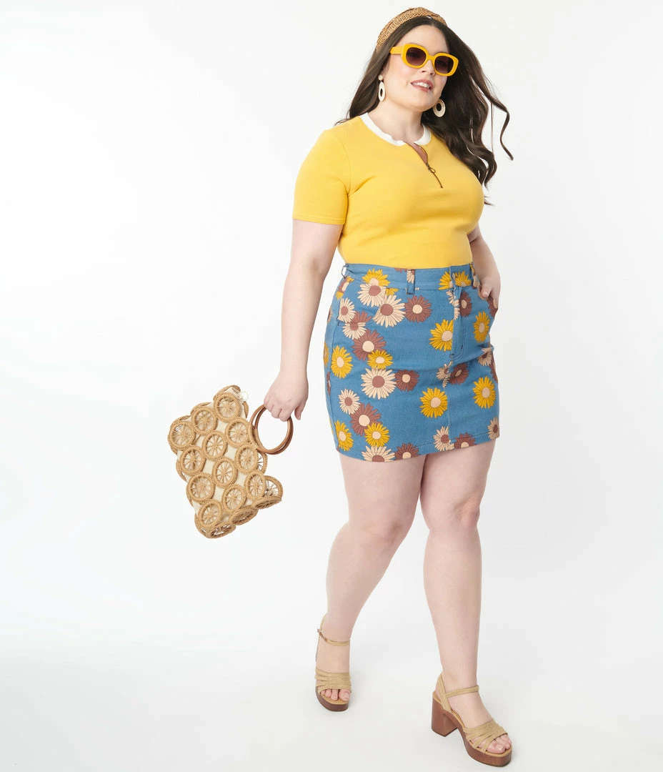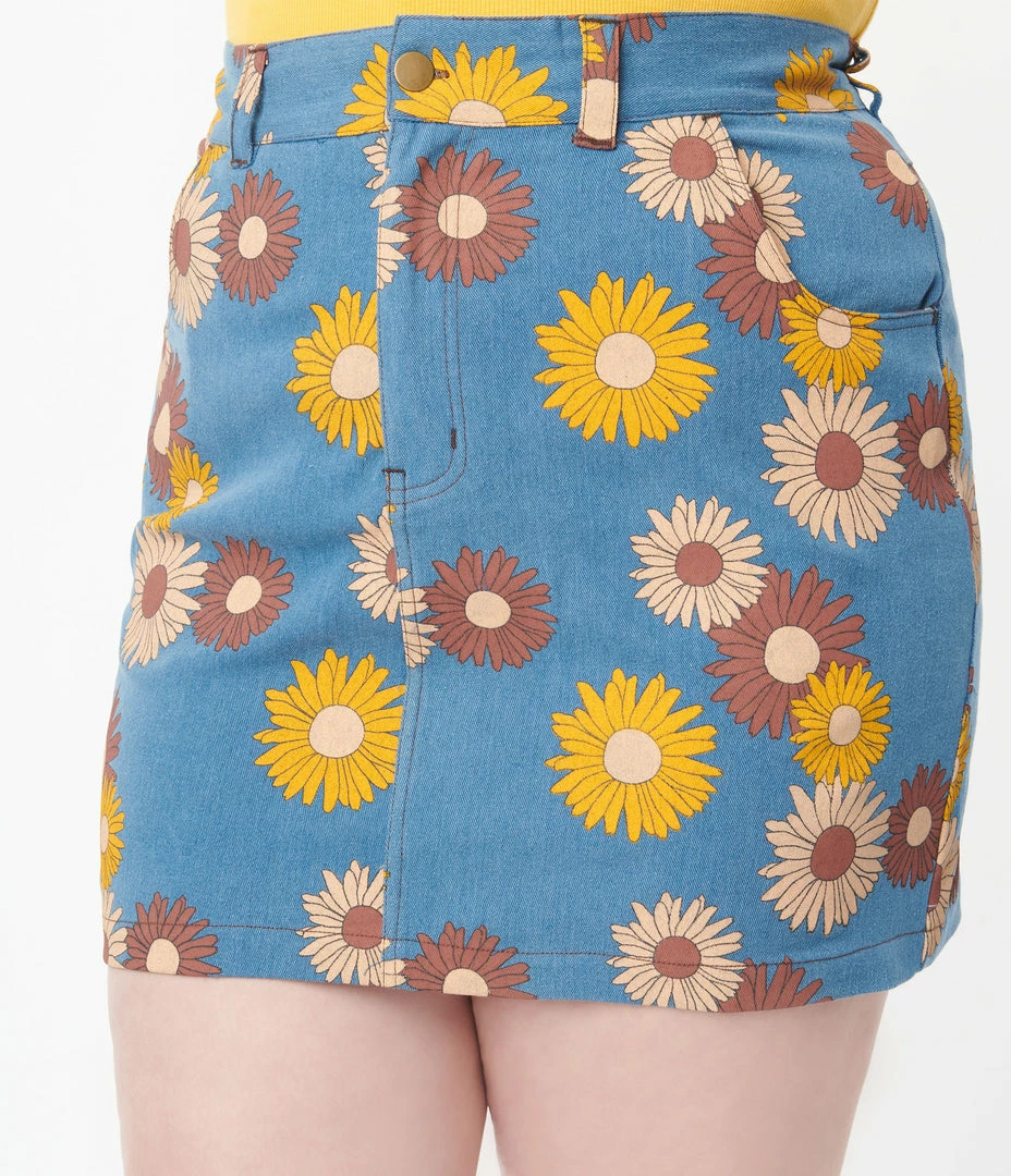 This adorable plus size miniskirt is crafted in a denim blue fabric featuring a charming screen print of brown, beige, and mustard daisies throughout while the banded waist is cinched with a front zipper and button. Outfitted with side pockets for sensational function!