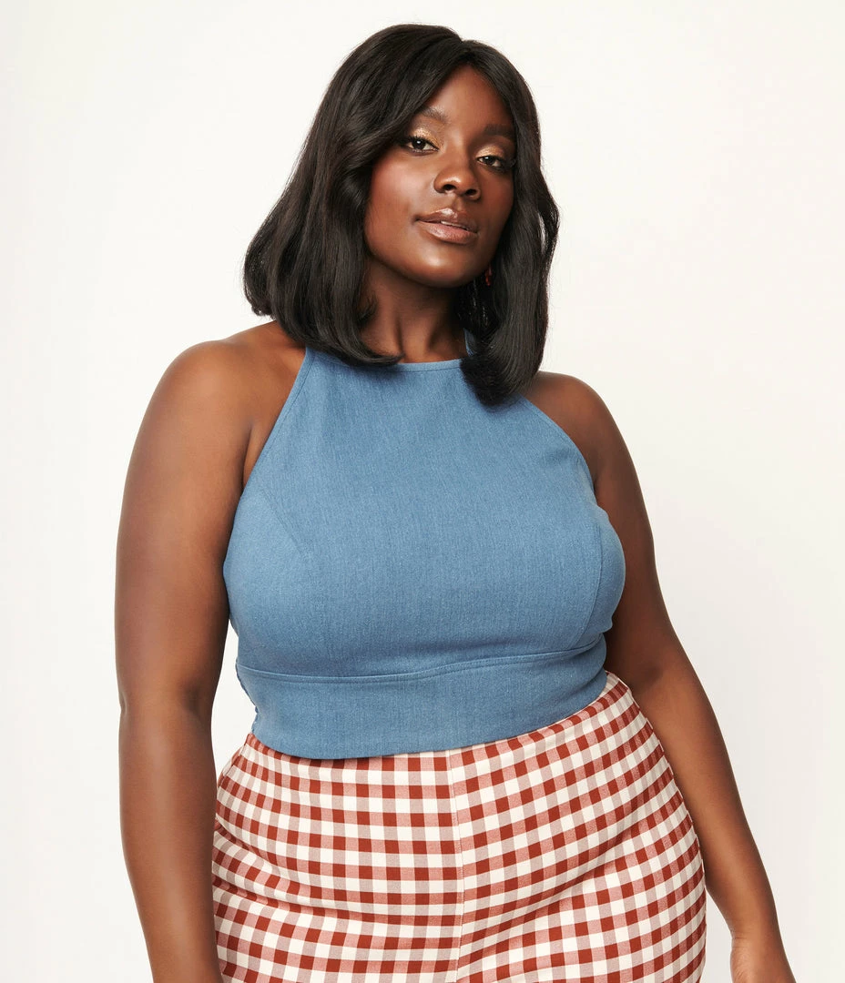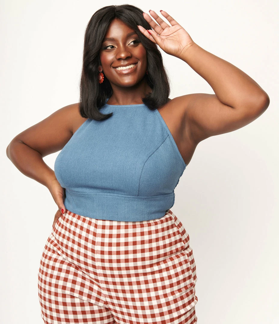 Your primary amour, gals! Stay sultry under the summer rays in the plus size Main Squeeze Top from Unique Vintage, crafted in a fabulous blue denim for classic rockabilly vibes. The halter neckline is secured with self tie spaghetti straps while the banded waist is cinched with a smocked back!