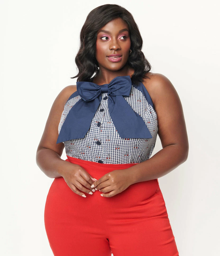 Time to write some new rules, gals! Summon the summer vibes with the plus size Paulson Top, fresh from Unique Vintage and cast in a lightweight woven fabric that dances with cherries printed throughout the navy blue and white gingham pattern. The button up front leads to a modest neckline embellished with a solid navy blue faux bow and framed by a sultry sleeveless design. The darted silhouette drops into a curved hemline for easy pairing with your favorite skinnies!