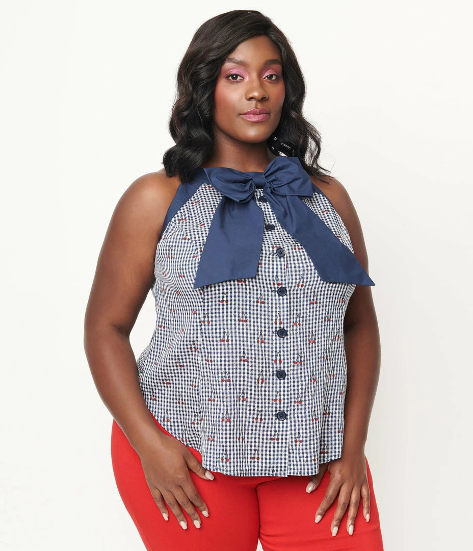 Coupon ๐ Sale Unique Vintage Plus Size Navy Gingham & Cherry Print Paulson Top ๐คฉ