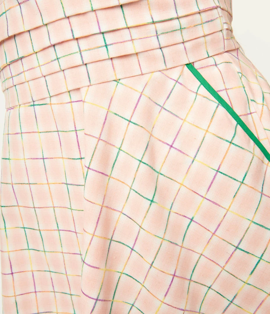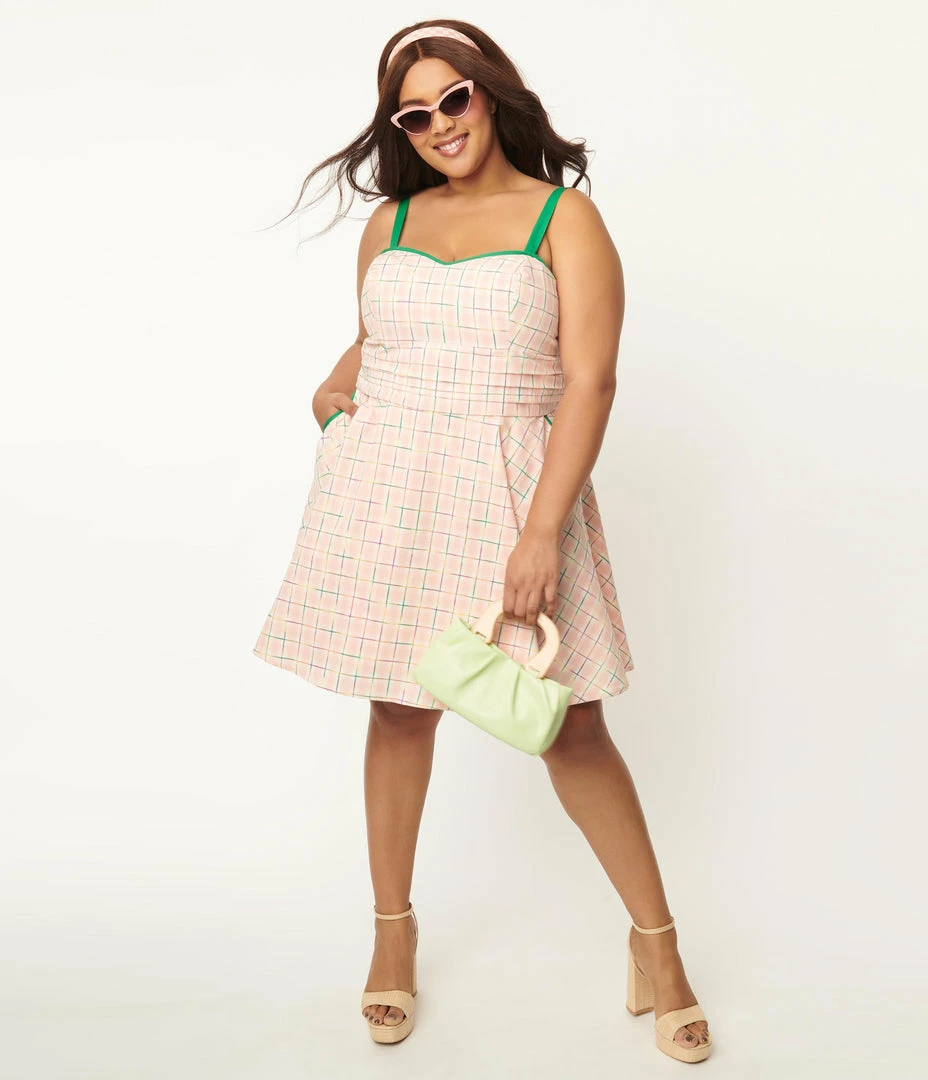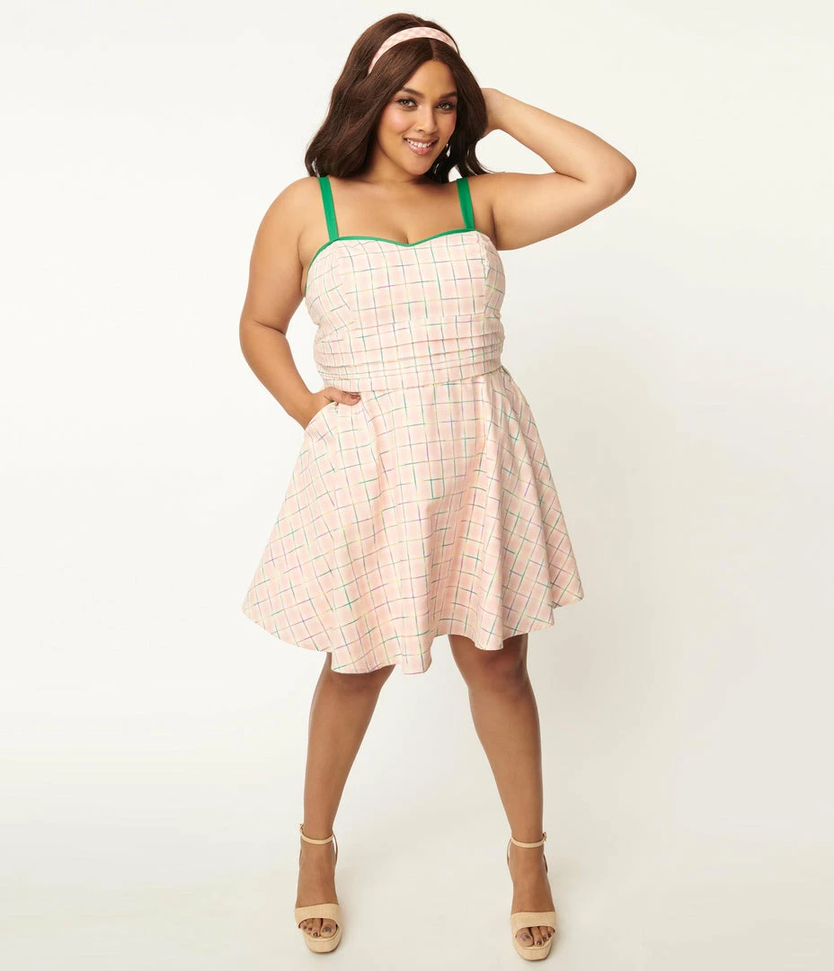This cute plus size flare dress is crafted in a woven fabric of pink plaid and rainbow windowpane stitching, secured with green adjustable spaghetti straps. Outfitted with side pockets and a back zipper.