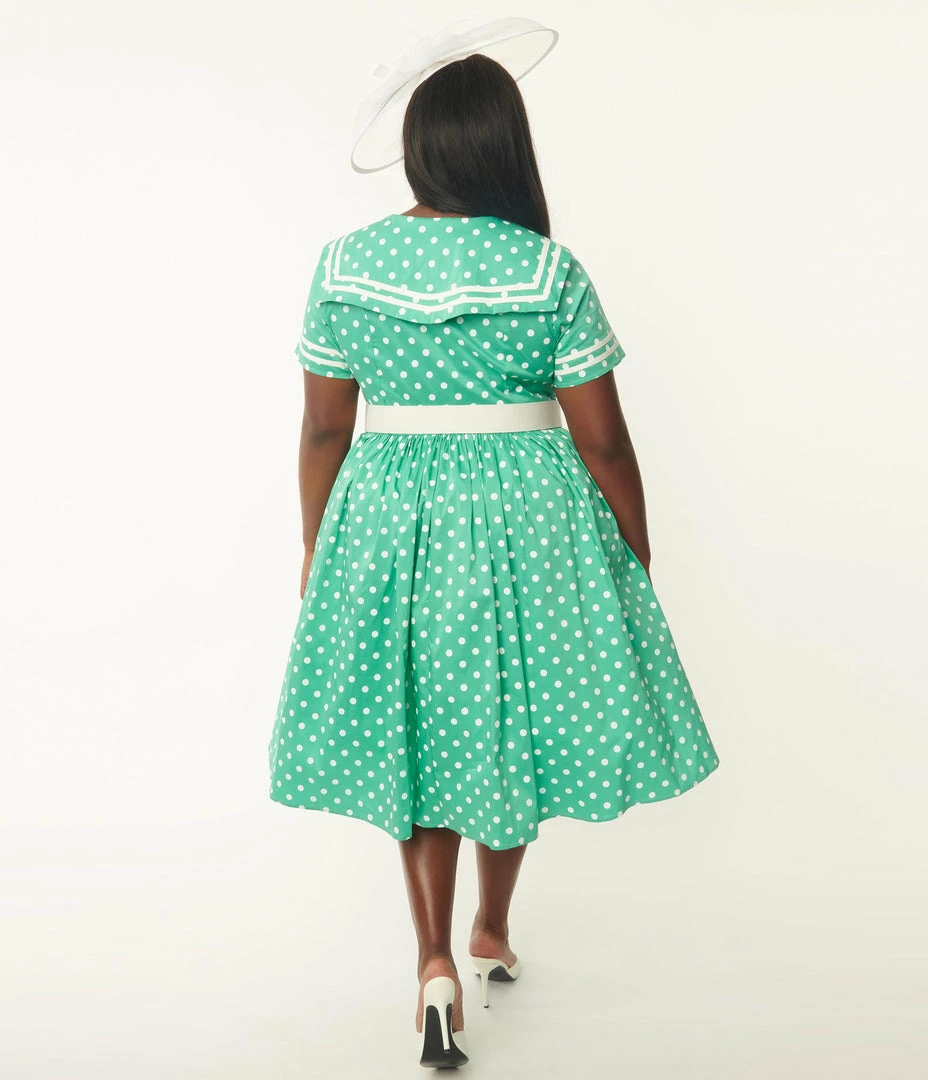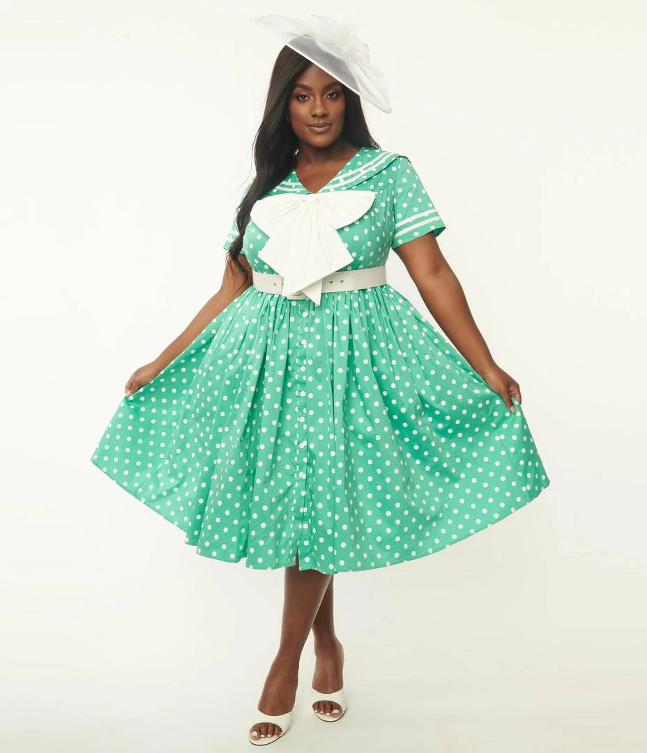 Promo 😍 Sale Unique Vintage Plus Size Seafoam & White Polka Dot Seas The Day Swing 👗 Dress 😉