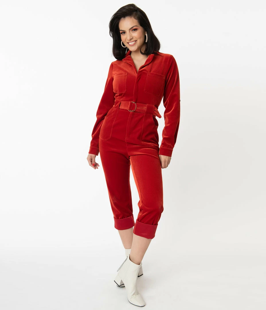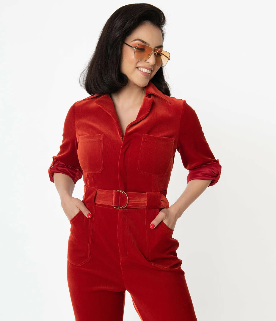 Turn your signature into an autograph, dames! Set your sights for the sky with this radiant jumpsuit from Unique Vintage, crafted in a brilliant rust orange corduroy. The Trixie Jumpsuit is secured with a front zipper and topped with a notched lapel while the long sleeves drop into button cuffs that boast button tabs for versatile styling. The banded waist is cinched with a matching belt while side, back, and chest pocket provide modern convenience. Complete with cropped legs with faux rolled cuffs for an easy climb up the social ladder!