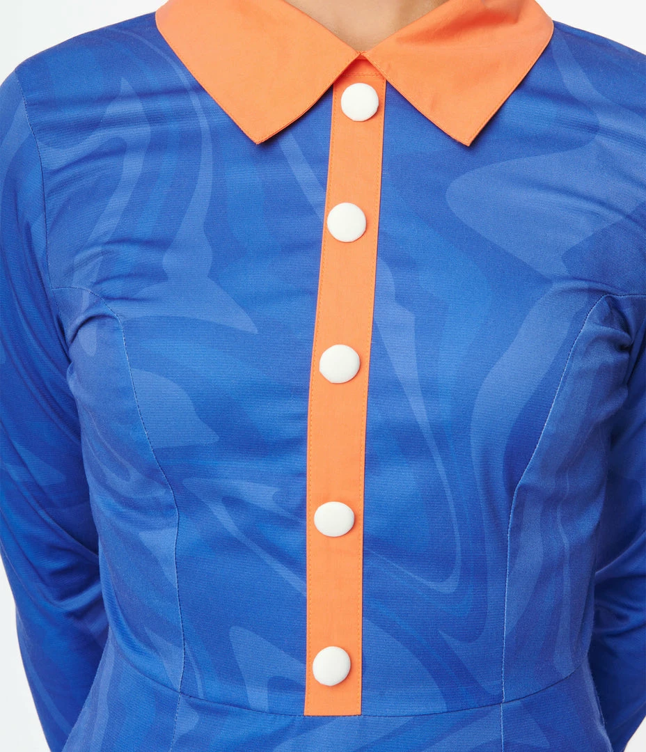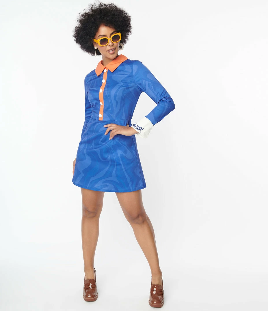 This retro flare dress, in collaboration with Scooby-Doo, is crafted in a woven fabric that dances with a groovy print in shades of blue. The solid orange collar tops a faux button up placket and is framed by the long sleeves that drop into button cuffs embroidered with โScooby-Doo!โ. Complete with side pockets.