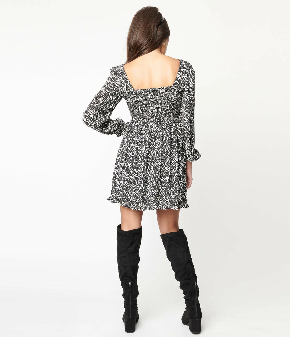 Express your fabulousness, darling! This sweet babydoll dress is crafted in a lightweight crepe that dances with a white leaf print throughout a black backdrop for a dazzling pattern. The smocked bodice flatters your feminine features, outfitted with a pull tie accent, while the long sleeves drop into an elastic banded cuff. The high seamed waist is accented with dainty ruffles while the gathered flare skirt dances high above the knees!