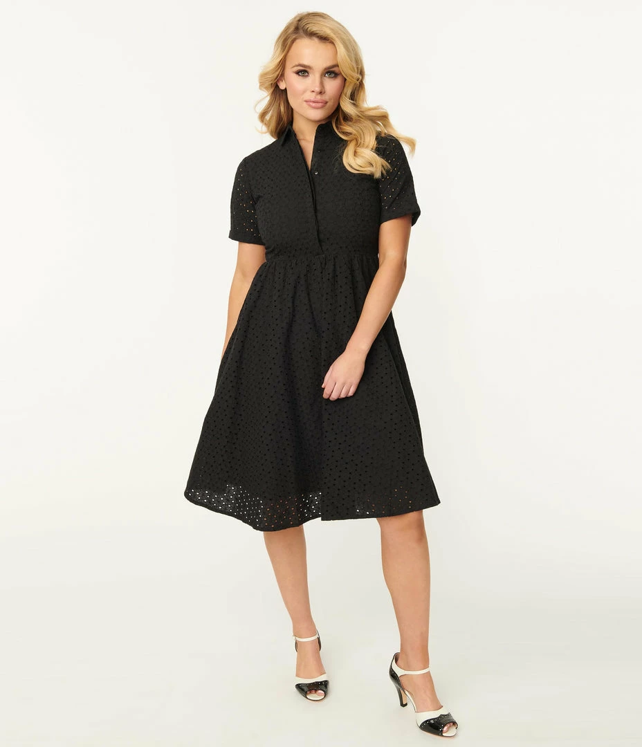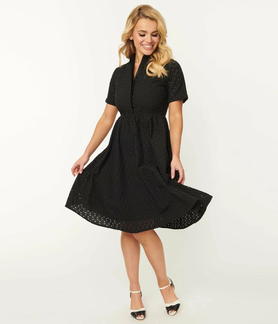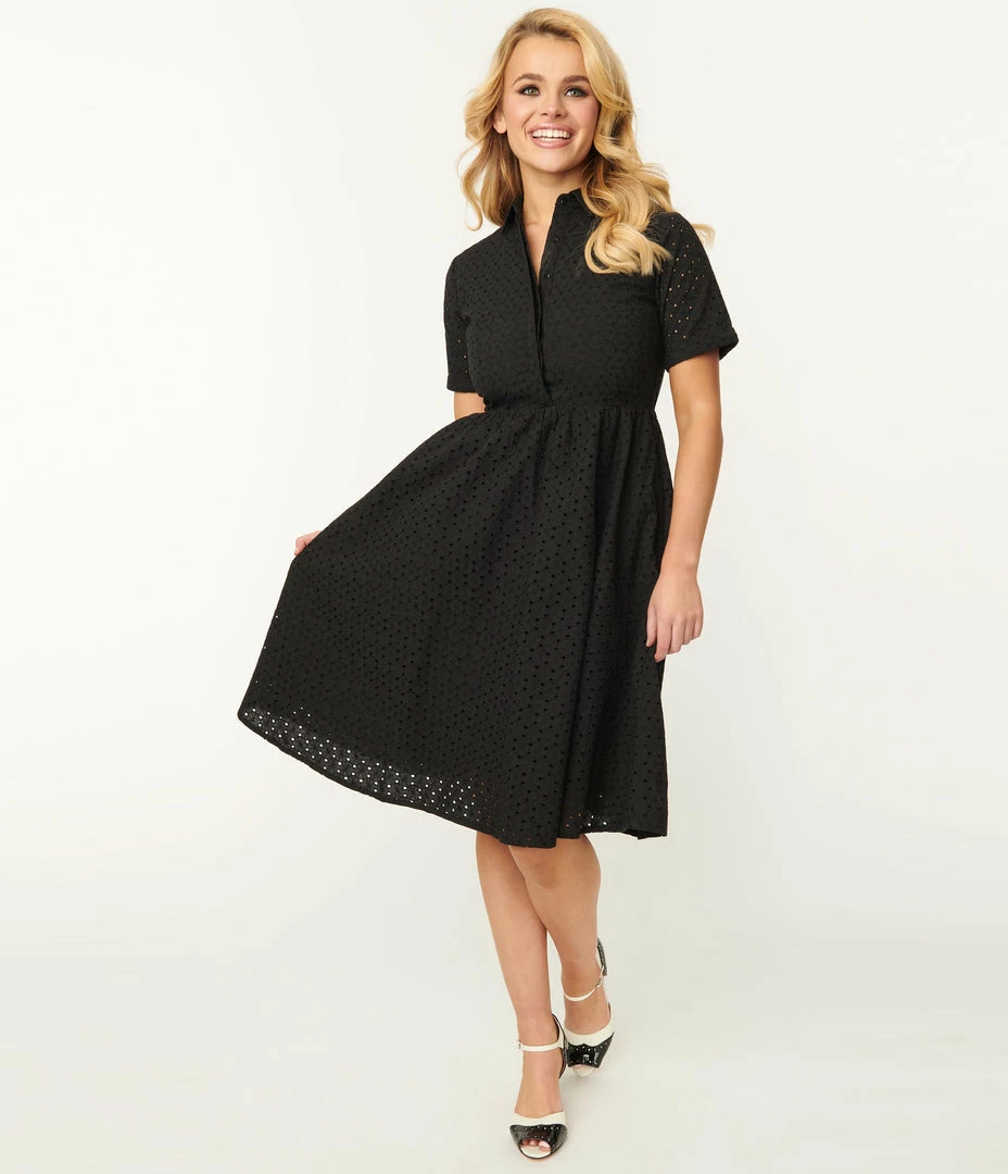 Crafted in black cotton eyelet, with a button up bodice leads to a classic collar, framed by short sleeves while the seamed waist is cinched with a side zipper. The swing skirt drops to your knees, complete with side pockets.