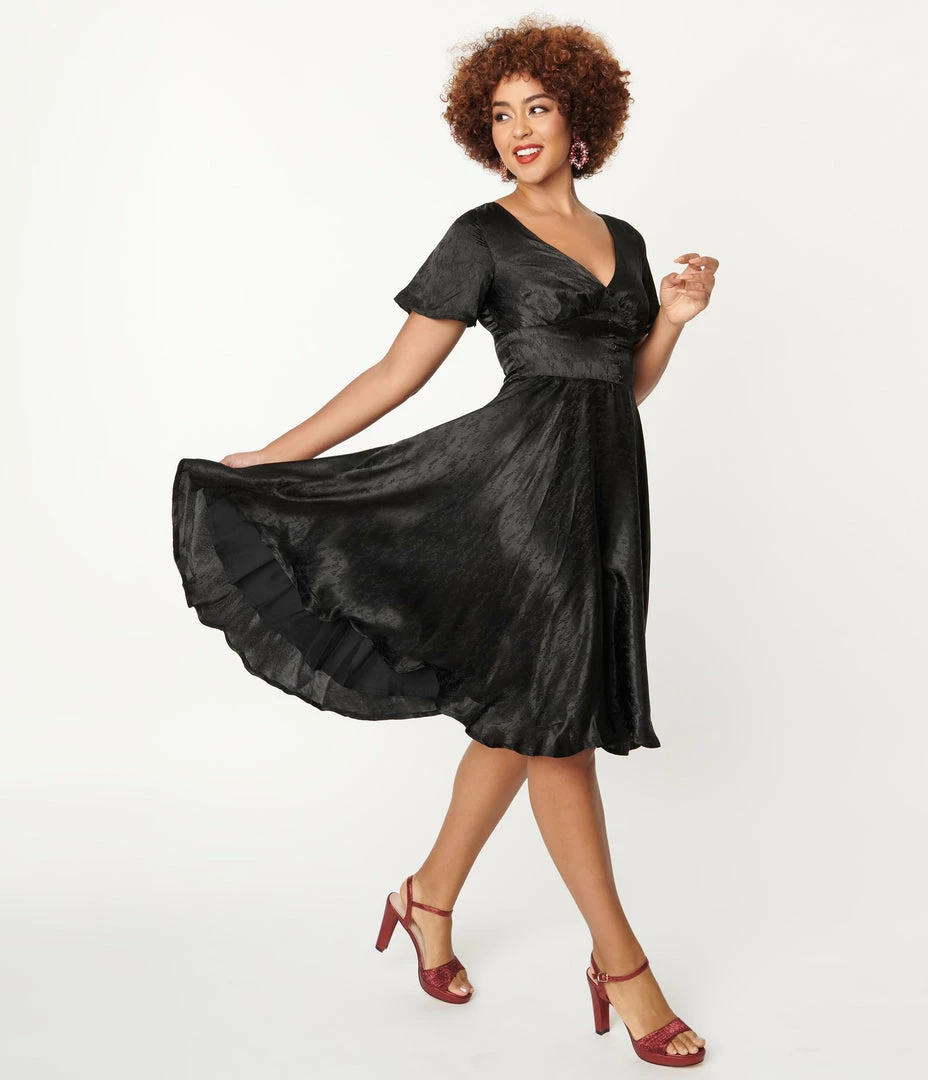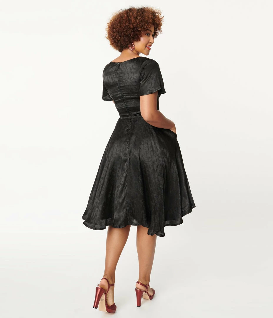 Make your heart sing, darling! This sweet mid-century inspired dress is a dream come true, crafted in a gorgeous black charmeuse-style fabric that dances with an embossed leaf pattern throughout. The charming V-neckline bodice features a wide, pointed waistband centered with faux buttons and framed by sweet short sleeves. A back zipper nips in your figure as the sweeping swing skirt is outfitted with side pockets for modern frolics!