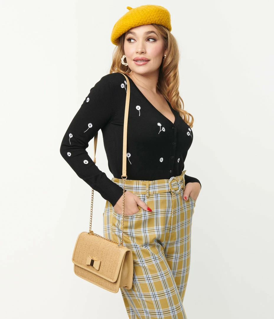This darling cardigan is crafted in a black soft knit and features white embroidered daisies throughout. The button front leads to the V-neckline framed by slender long sleeves.
