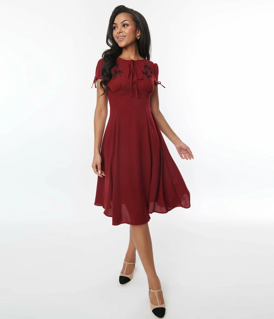This lovely swing dress is crafted in a lightweight burgundy woven fabric, delicately adorned with black floral on the shoulders. Completed with string ribbons on the sleeves and on the center of the neckline.