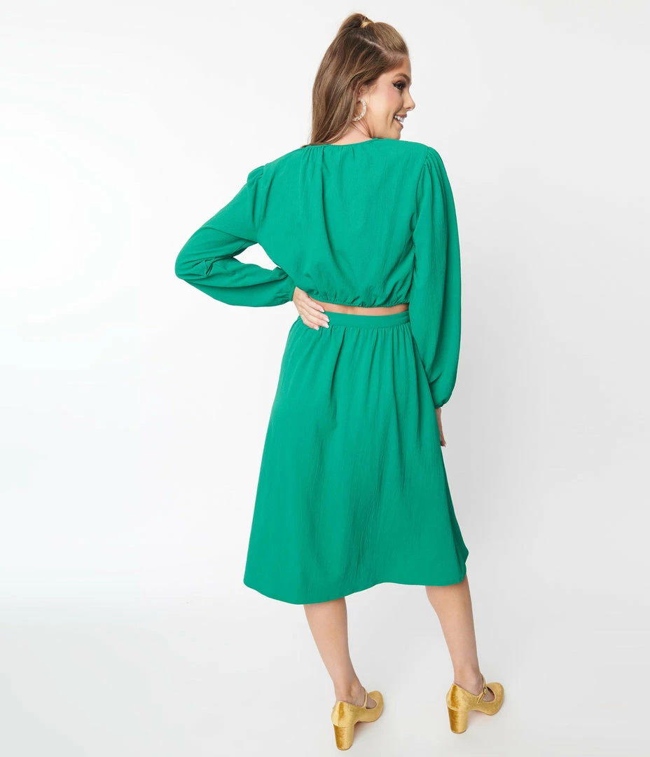 This fabulous set is crafted in a lightweight green crepe. The sultry crop top boasts a scoop neckline and long sleeves while the matching midi skirt boasts side pockets!