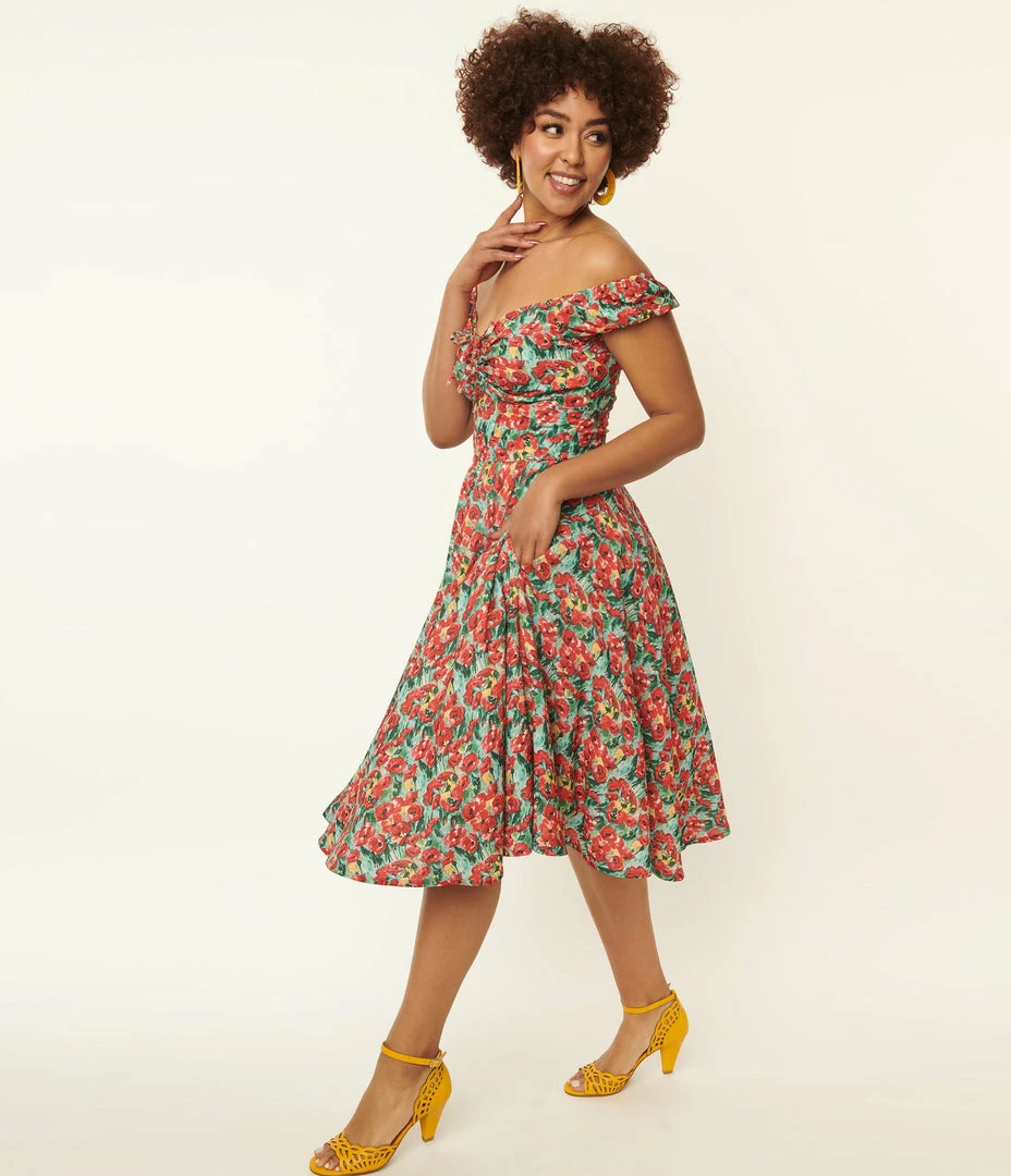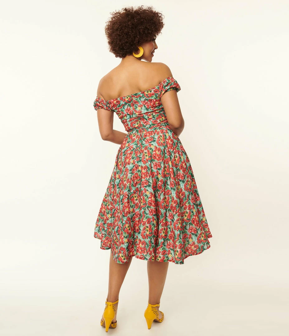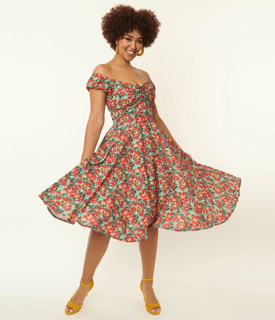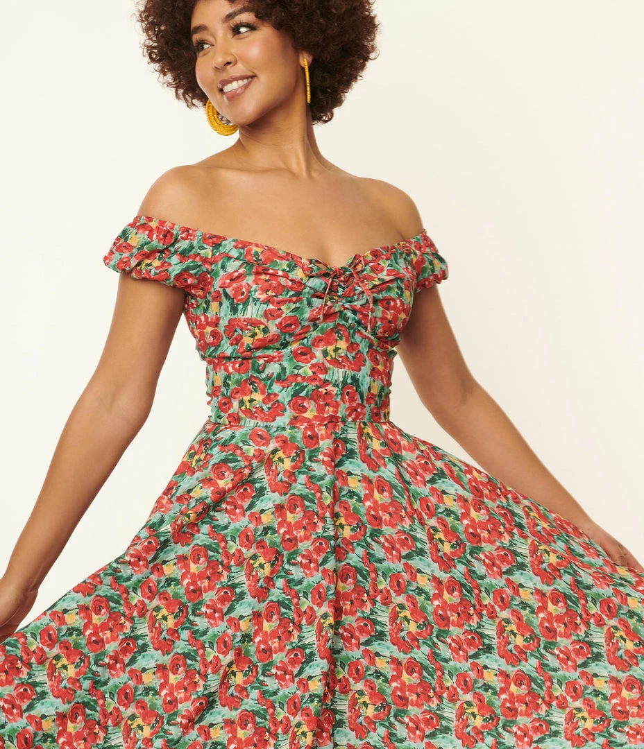 Crafted in a lightweight woven fabric with green and red florals throughout. Complete with sweetheart neckline, Bardot sleeves, back zipper, and swing skirt with pockets.