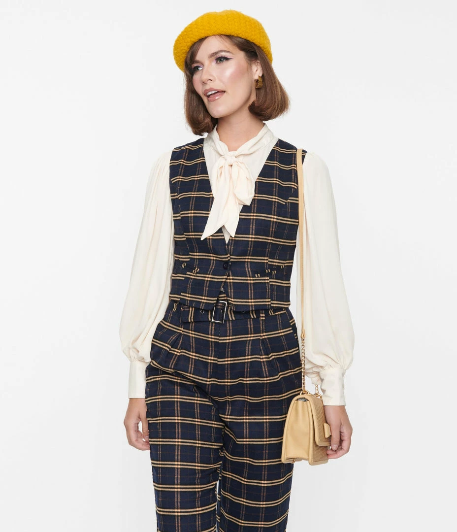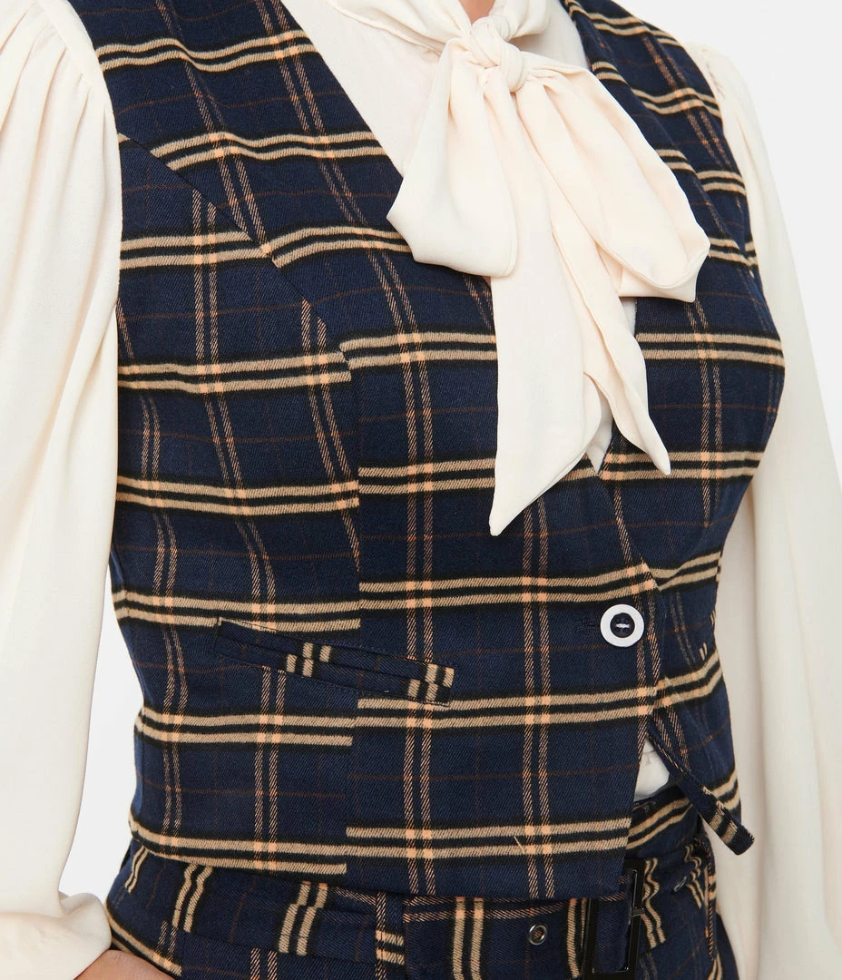 This chic waistcoat is crafted on a brushed woven blend that dances with a tan plaid pattern throughout a navy blue backdrop. Outfitted with a button up front and faux side pockets.
