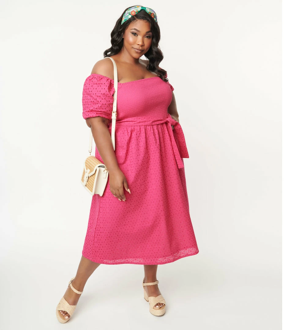 A stunning plus size midi dress crafted in a brilliant fuchsia pink eyelet. Complete with Bardot sleeves, smocked bodice, matching sash, and side pockets.
