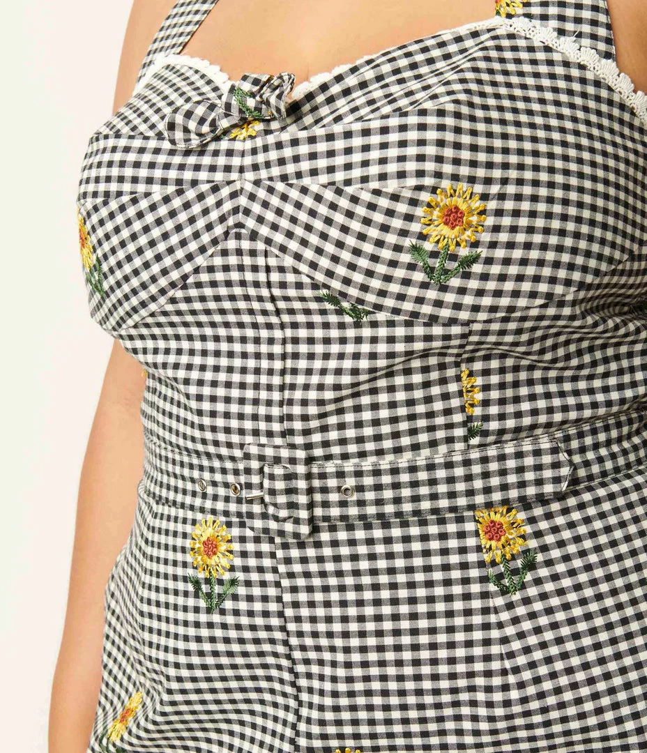 Sweet summer diversion, dears! This darling plus size playsuit is perfectly patterned with embroidered yellow sunflowers throughout the rockabilly black and white gingham background, crafted in marvelous cotton. The sultry sweetheart neckline is highlighted with lace trim while attached ties provide an adjustable halter fit. A self tie bow centers the bodice while smock side panels lend fabulous shape to your feminine form. The pointed banded waistline is nipped in with a matching belt while the cute shorts are outfitted with side pockets to stow away some petals. Outfitted with a back zipper to stay comfortable and stylish for the season!