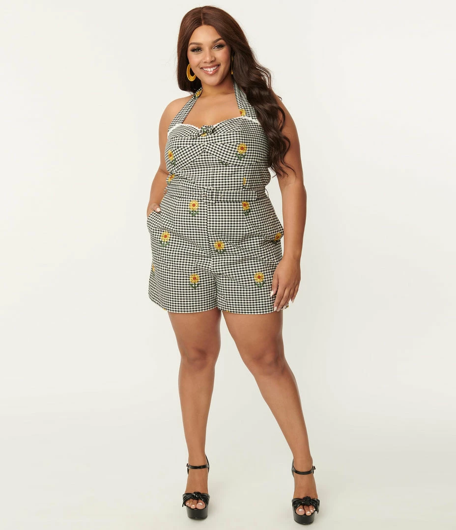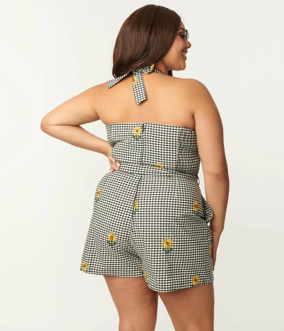 Coupon ๐งจ SHEEN Clothing Ltd Plus Size Black Gingham & Yellow Sunflower Davia Romper Rompers & Jumpsuits ๐