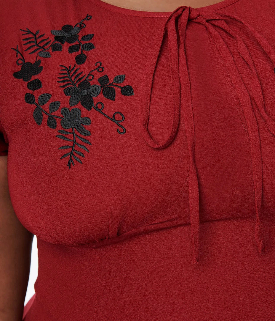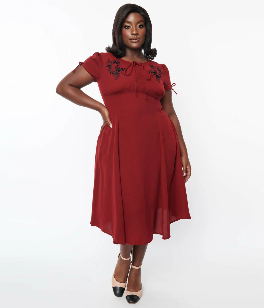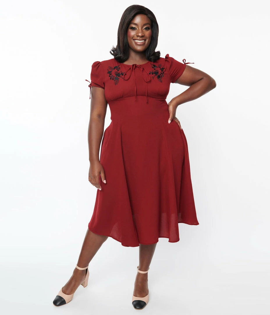 This lovely plus size swing dress is crafted in a lightweight burgundy woven fabric, delicately adorned with black floral on the shoulders. Completed with string ribbons on the sleeves and on the center of the neckline.