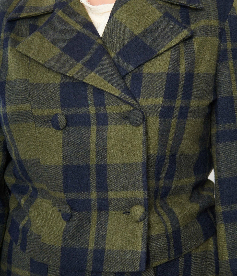 This darling jacket is crafted in a gorgeous green and plaid brushed wool blend, and boasts a sweet double breasted button up silhouette!