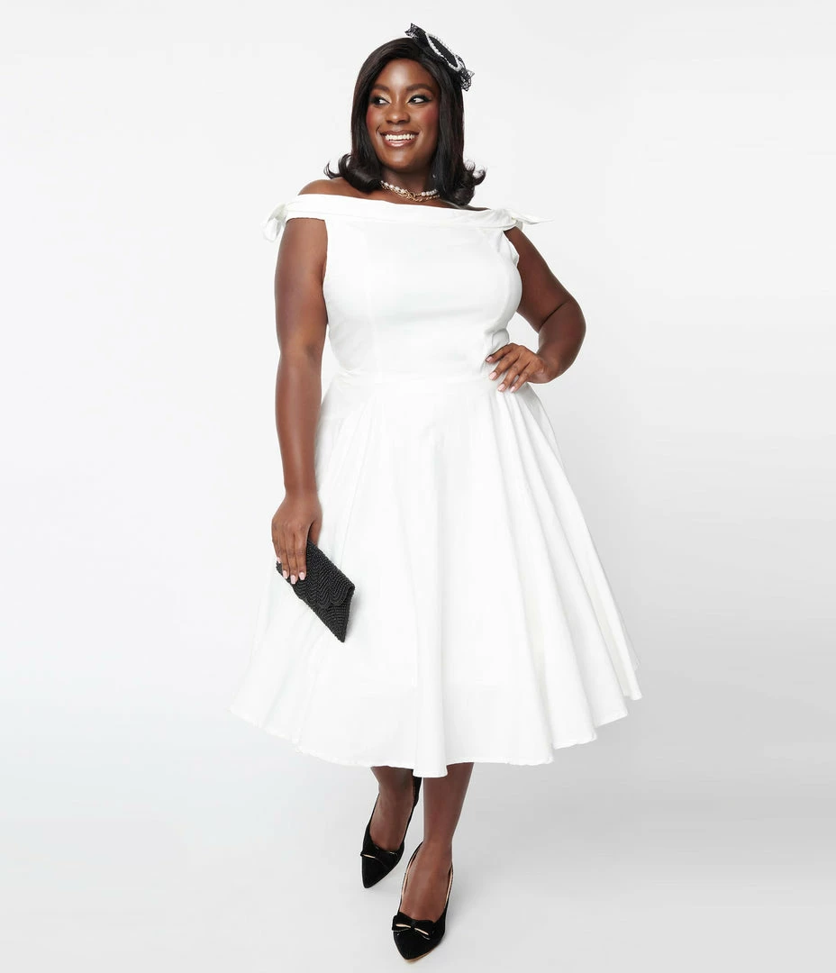 This sweet plus size wedding swing dress is crafted in a lovely ivory white cotton fabric that dances with you as you move. The princess seamed bodice boasts cowl neckline and off the shoulder silhouette with a fold over self tie sleeves secured with elastic straps. The full swing skirt drops to your knees and features side pockets for a modern touch!