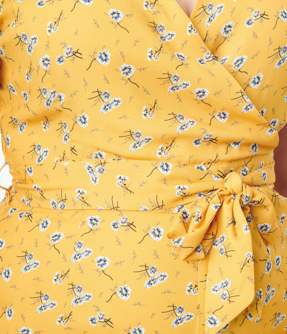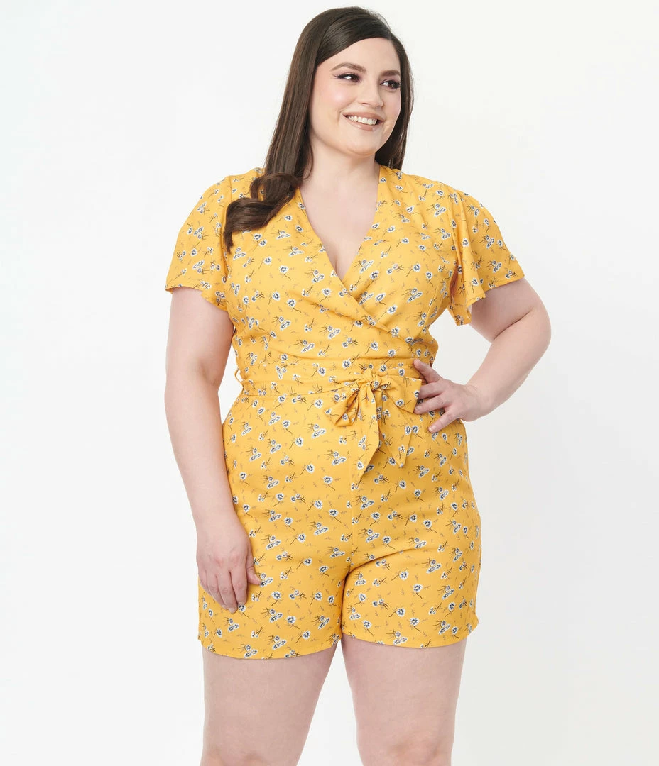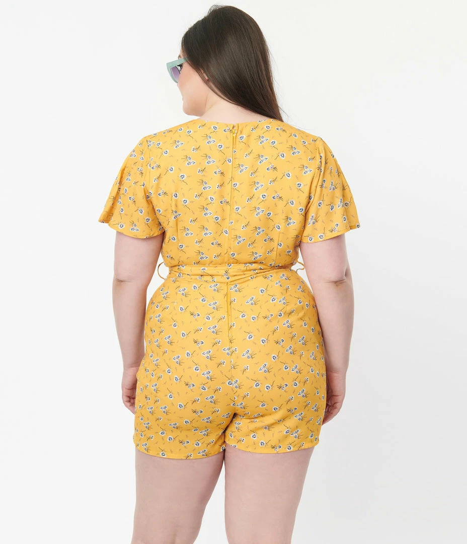 This delightful plus size romper is crafted in a lightweight crepe that features white floral throughout a mustard yellow backdrop. Outfitted with a surplice neckline, back zipper, matching sash, and side pockets.