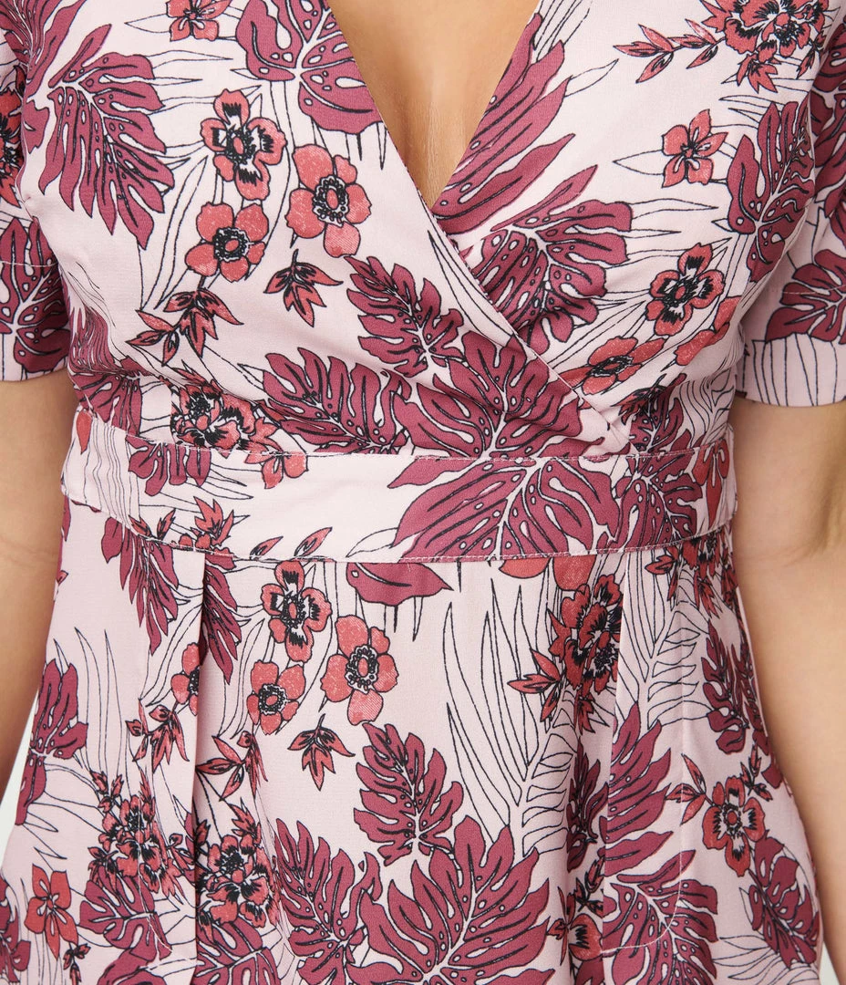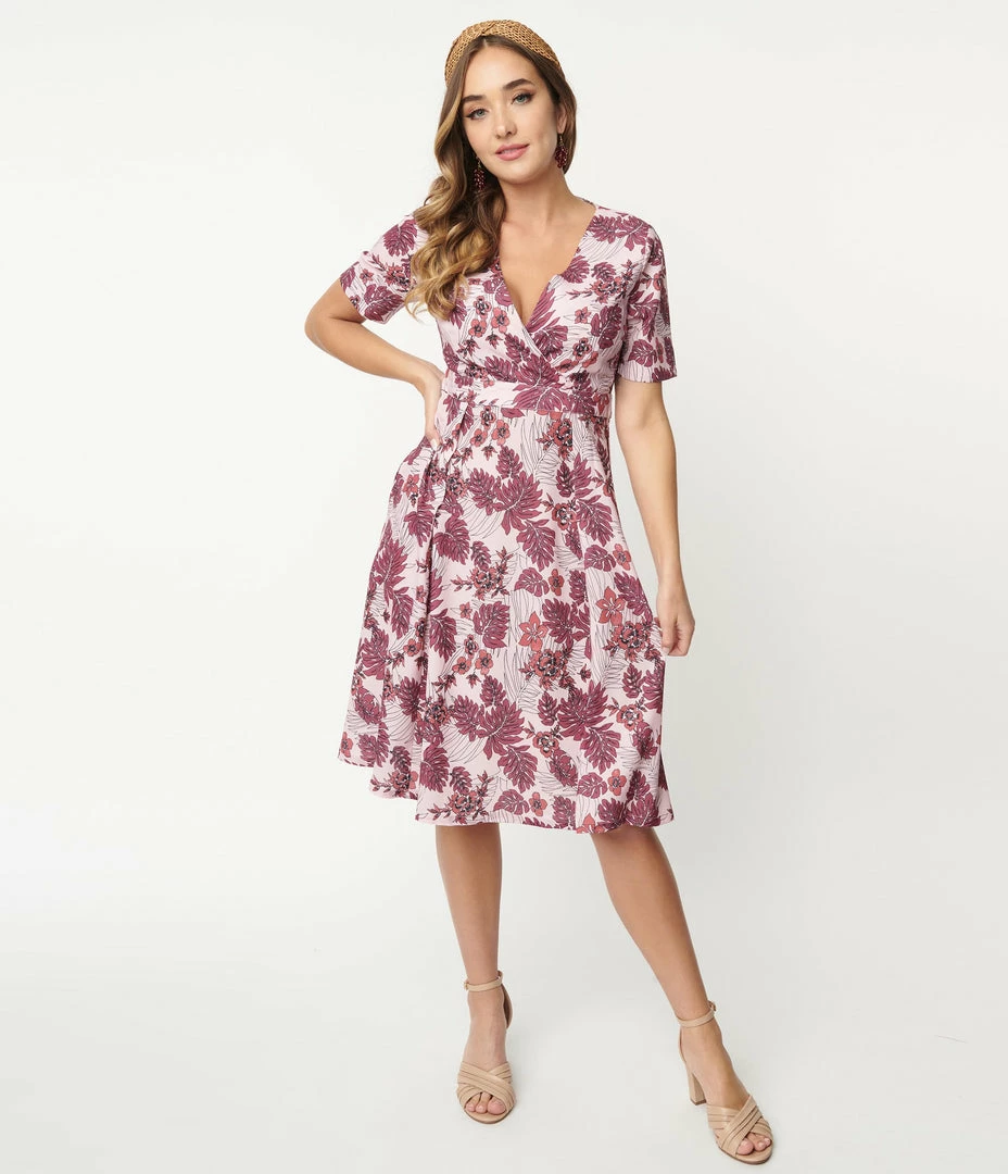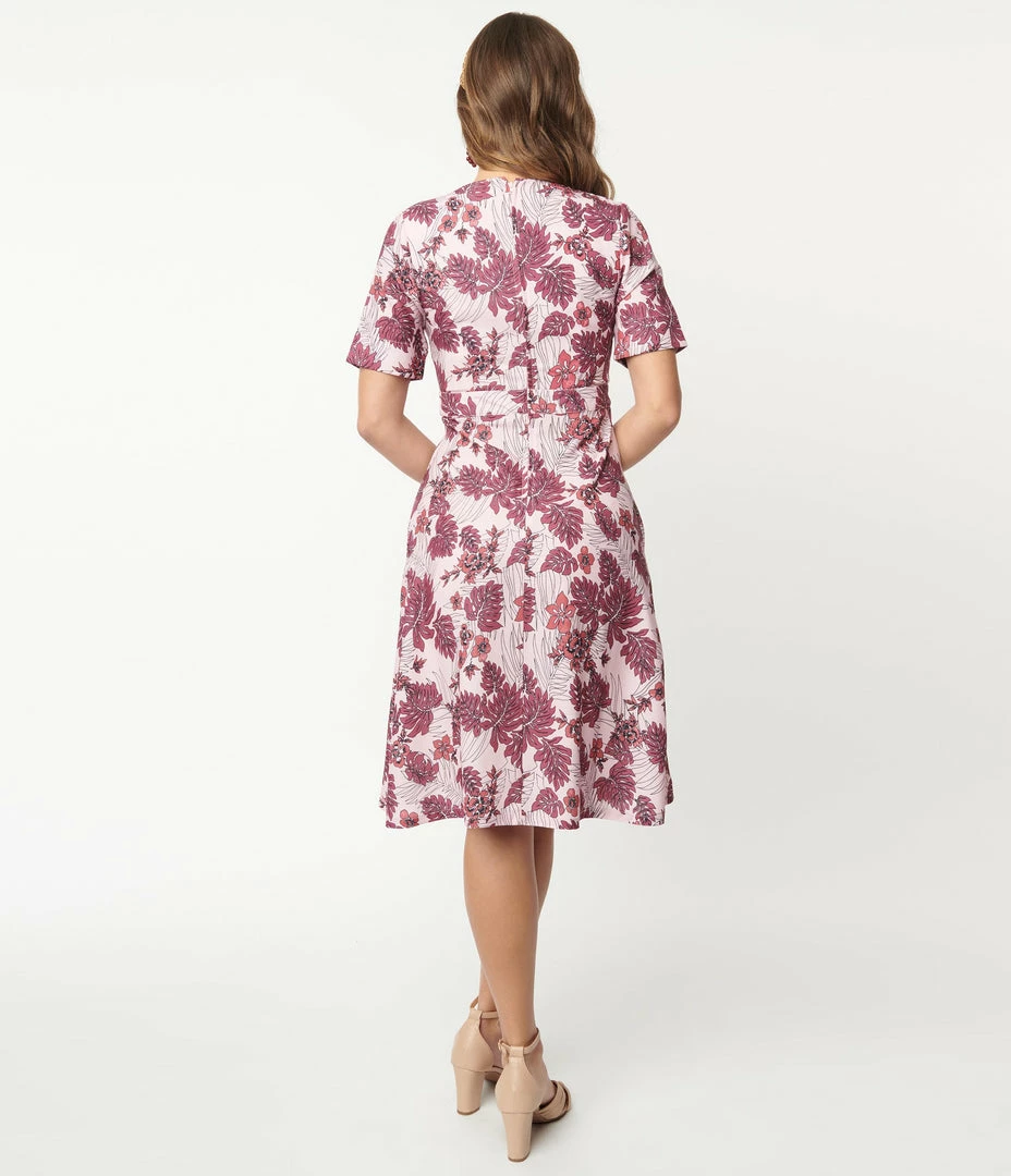 A sweet swing dress crafted in a lightweight woven crepe that features purple tropical leafs throughout a dusty pink backdrop. Outfitted with a back zipper and side pockets.