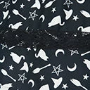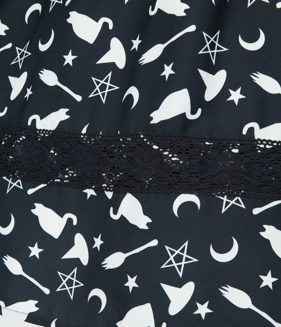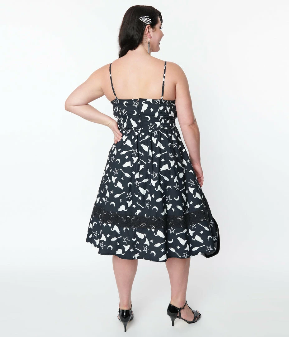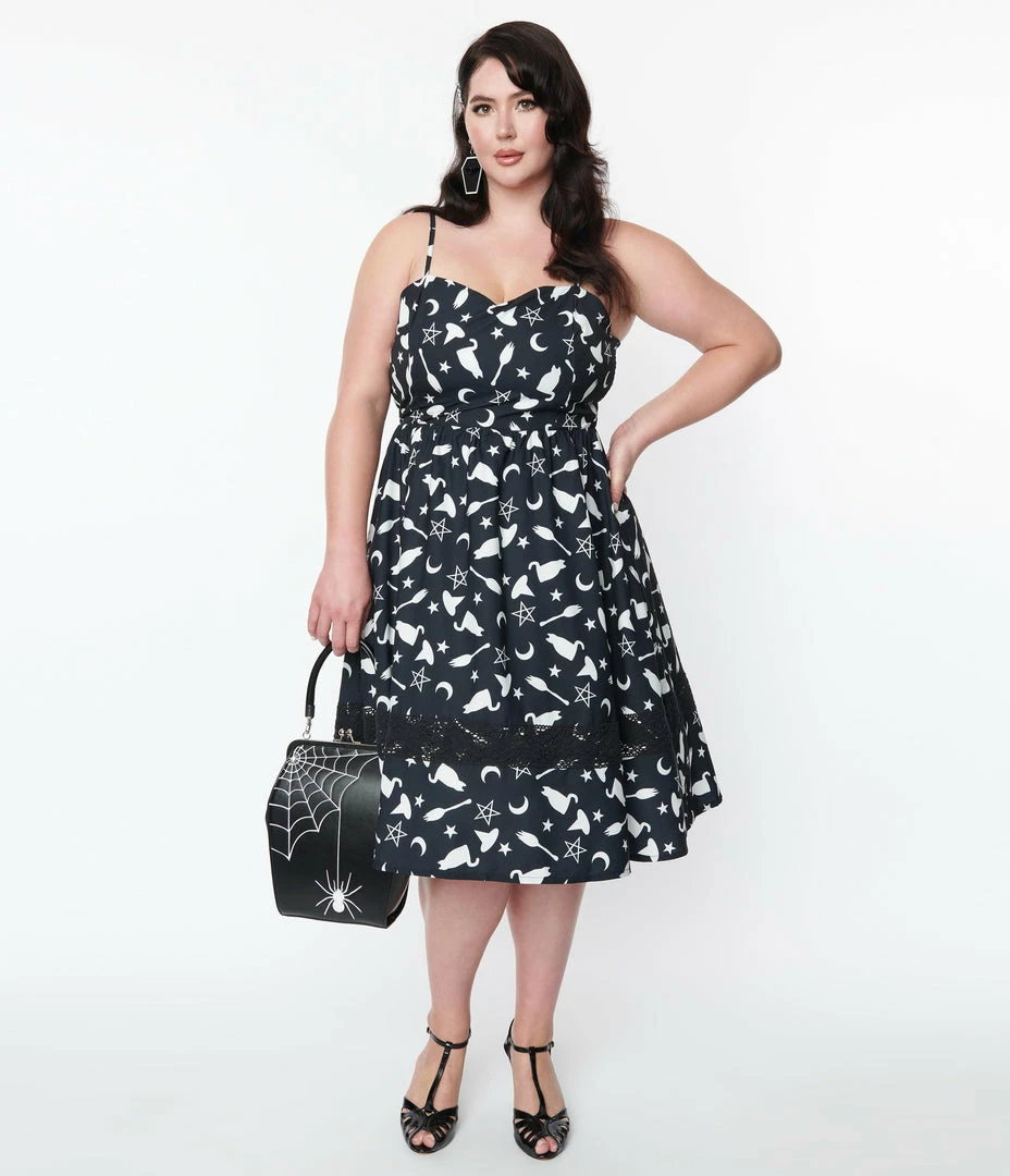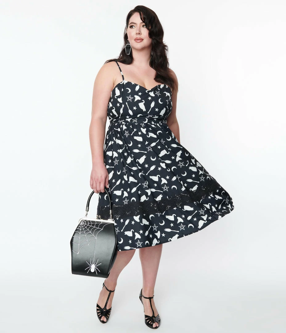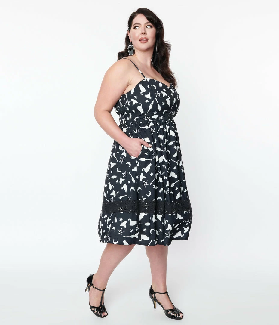 Send chills up their spine with this spooky plus size swing dress, crafted in a woven crepe that dances with a witching hour print of ivory cats, stars, witch hats, and brooms throughout a black backdrop. The sweetheart neckline is secured with adjustable straps while the side smocked panels hug your curves. Complete with back zipper and side pockets!