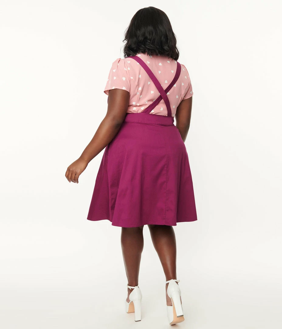 Cause a disturbance, darlings! Fabulously vintage, this charming plus size pinafore skirt is a sensational addition to your silhouette, crafted in a stretch cotton for old school swooning in a marvelous purple. The button adjustable suspender straps provide a sweet accent, while the skirt is nipped in with a side zipper and outfitted with side pockets for added function to this adorable flare skirt!.
