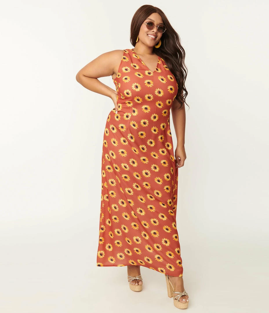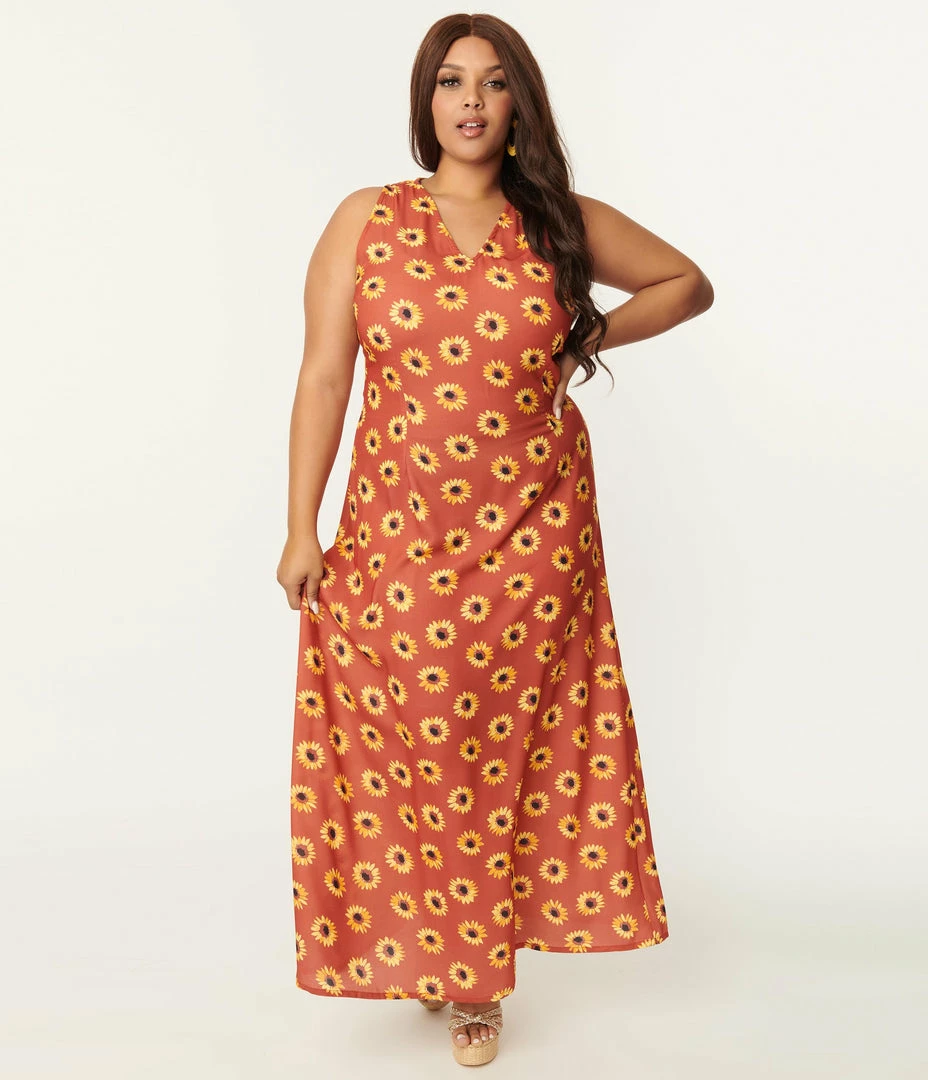 Bask in the sunshine, gals! This gorgeous plus size dress is crafted in a lightweight woven fabric that dances with yellow sunflowers throughout the rust orange backdrop. The sultry V-neckline is nipped in by the back zipper and framed by the sleeveless silhouette. The darted bodice flatters your curves while the maxi length skirt dances at your feet!