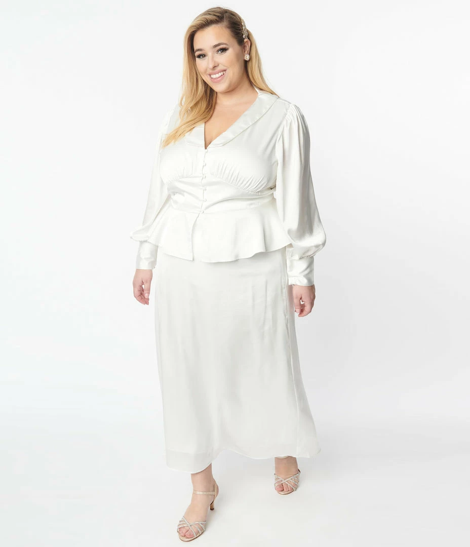 This fabulous plus size bridal blouse and skirt set is crafted in a gorgeous lightweight satin-like ivory. The classic lapel V-neckline is centered by the button front and framed by bishop sleeves, while the midi length skirt drops to your ankles.
